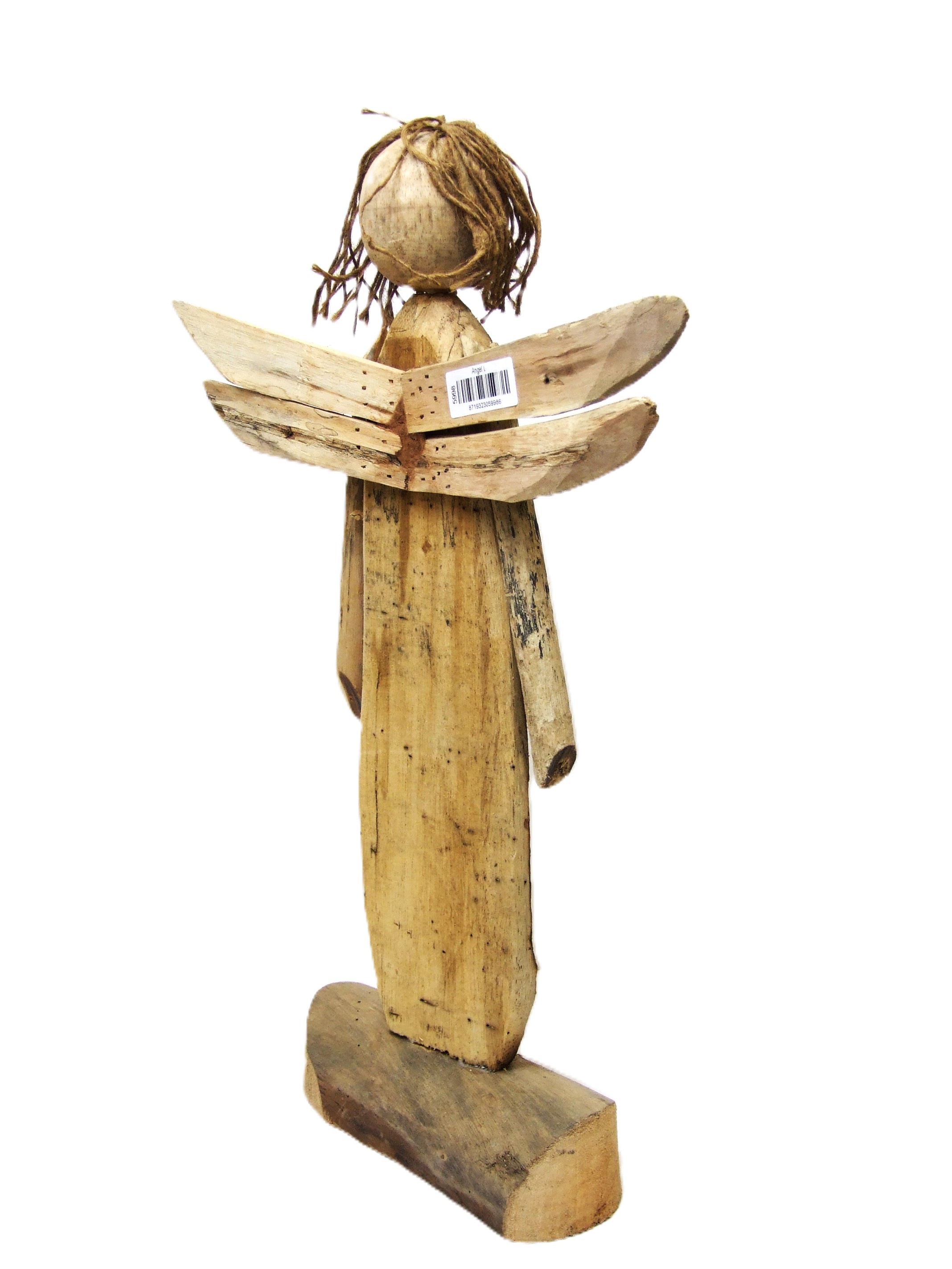 Przepiękna duża figurka anioła z surowego drewna, z włosami z jutowego sznurka.