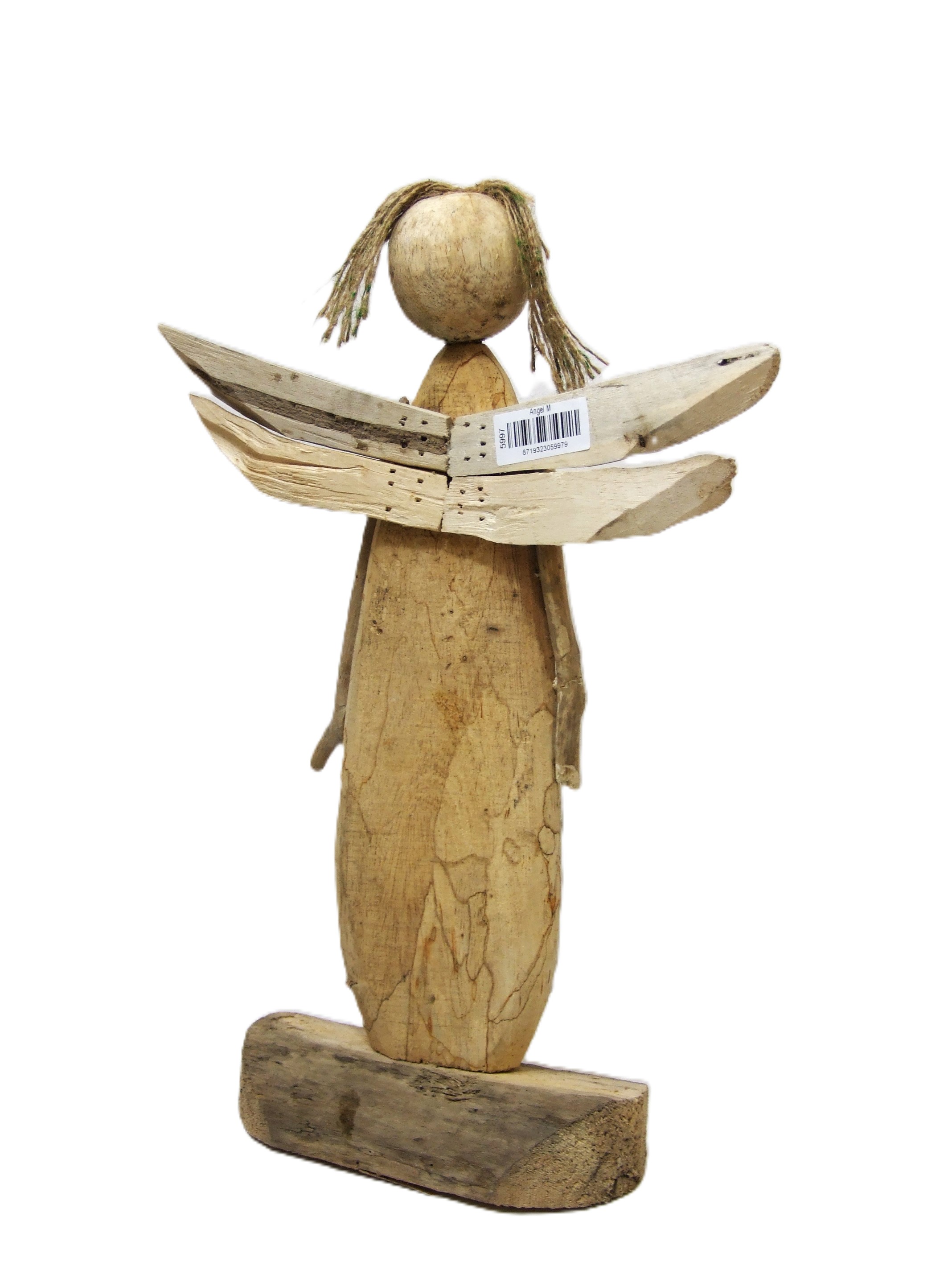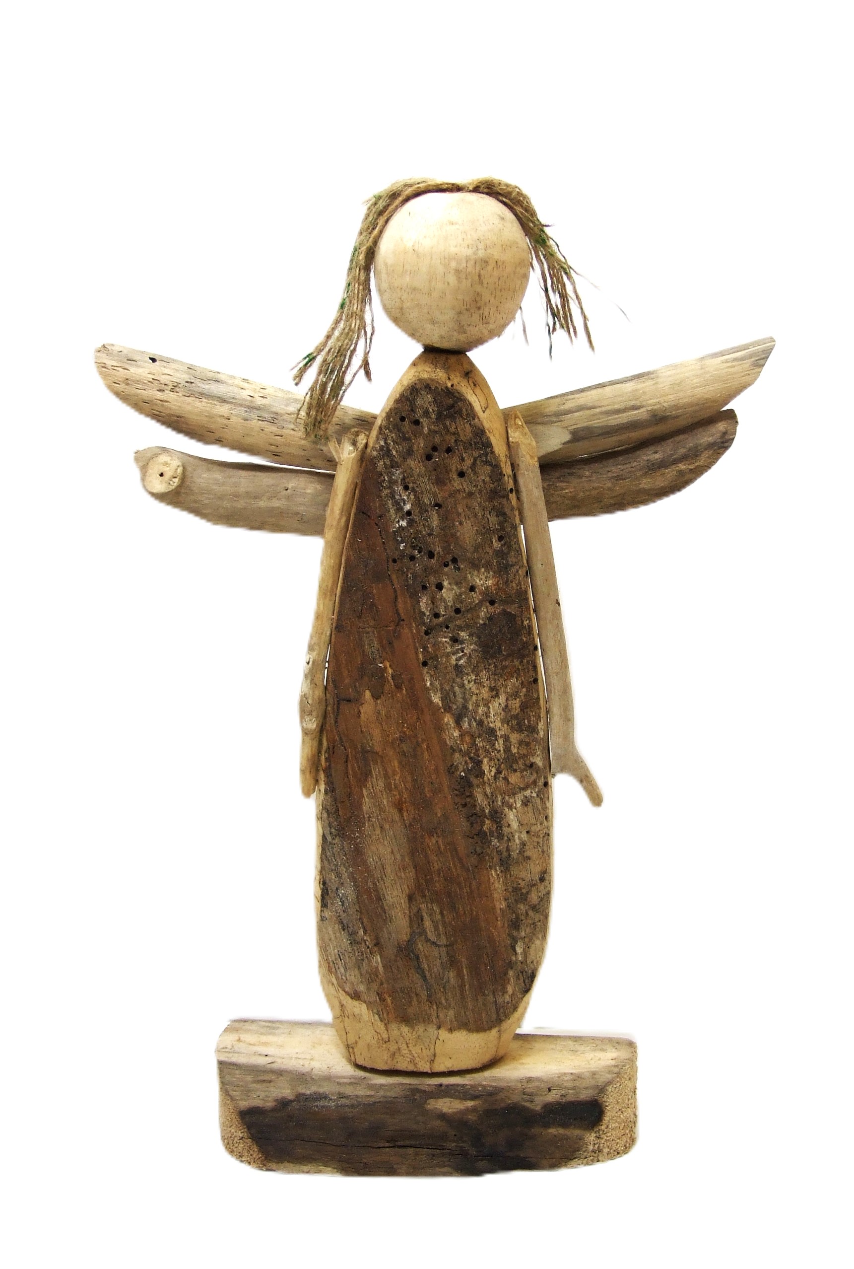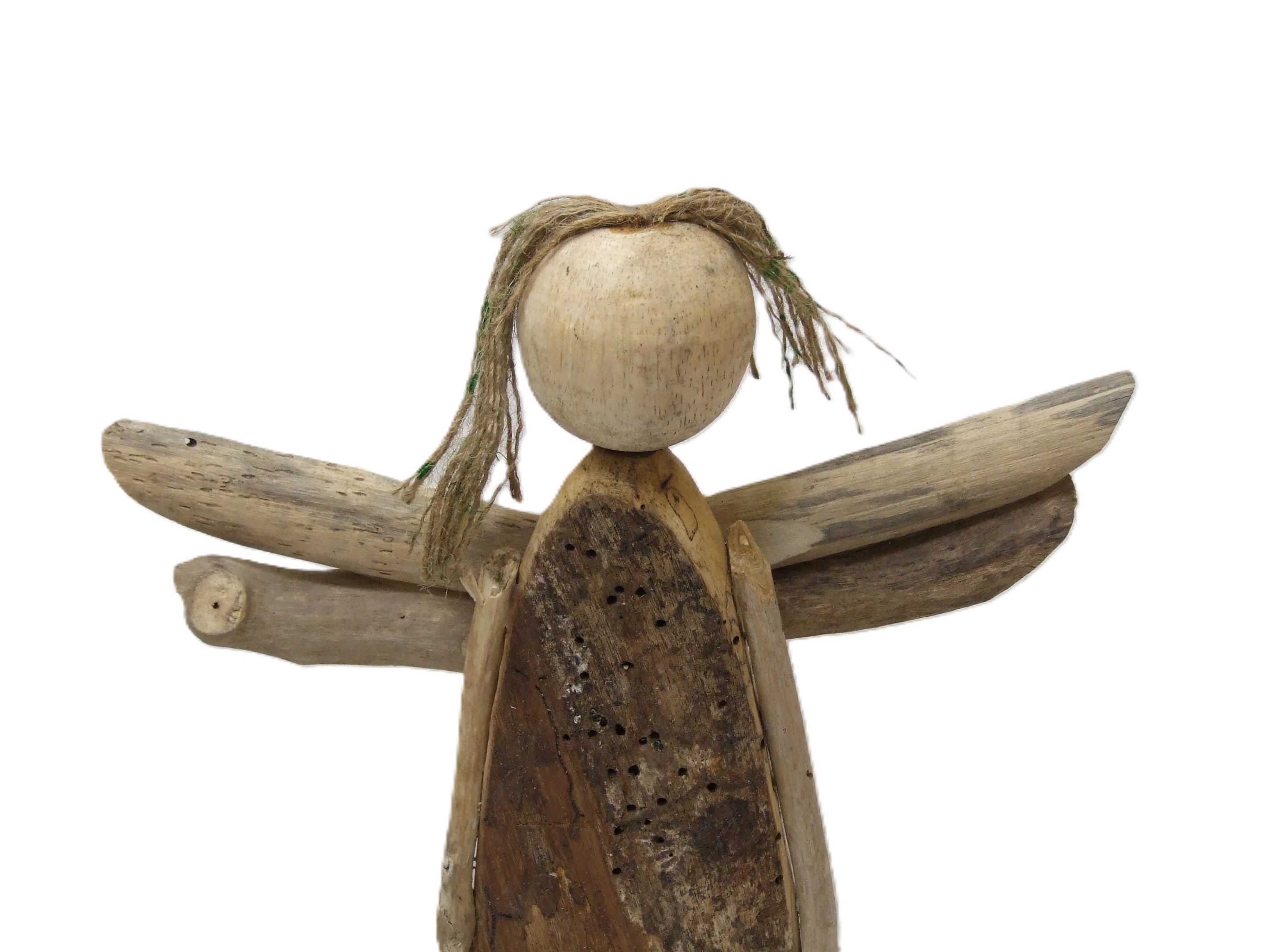 Przepiękna duża figurka anioła z surowego drewna, z włosami z jutowego sznurka.