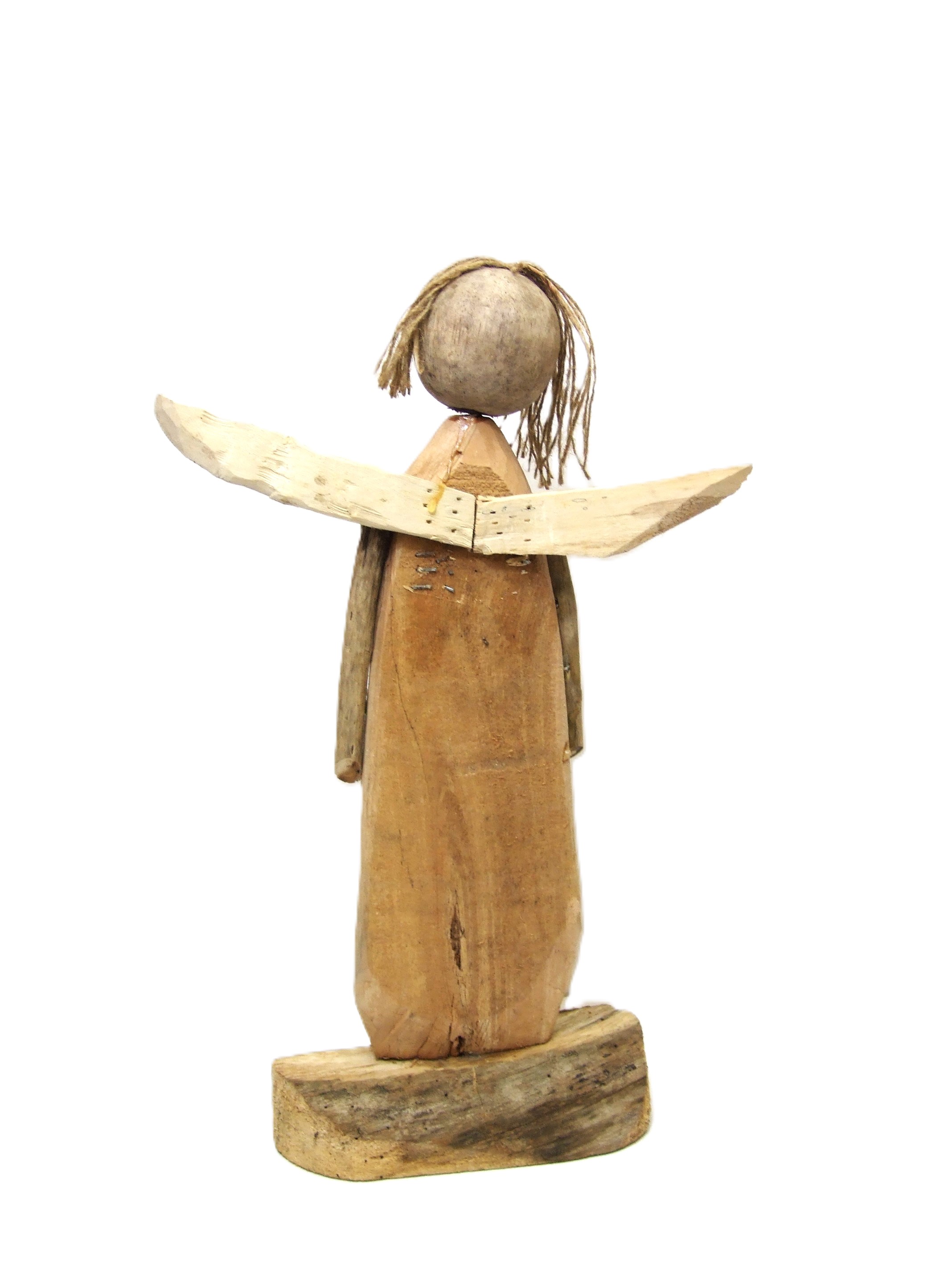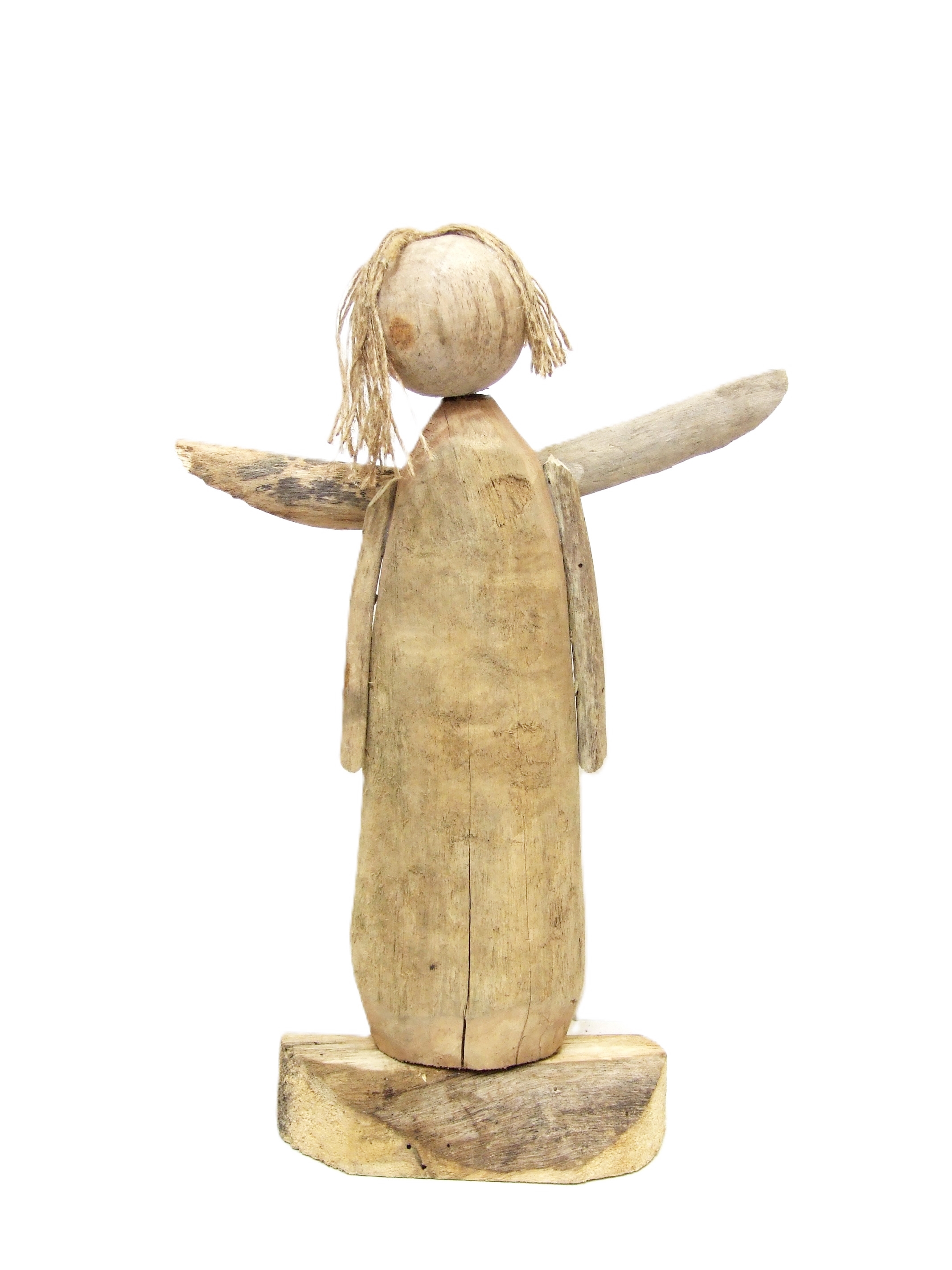Przepiękna duża figurka anioła z surowego drewna, z włosami z jutowego sznurka.