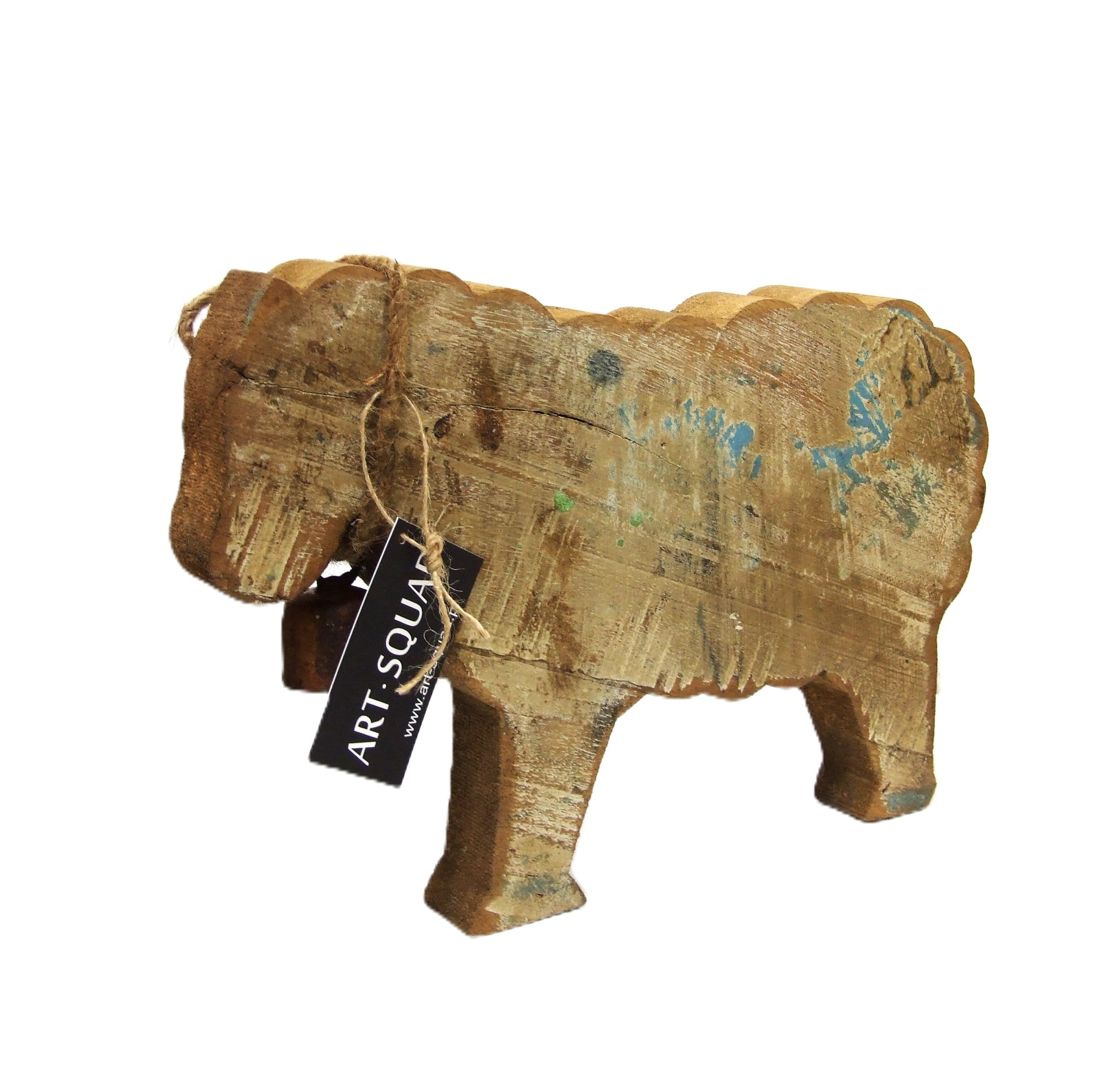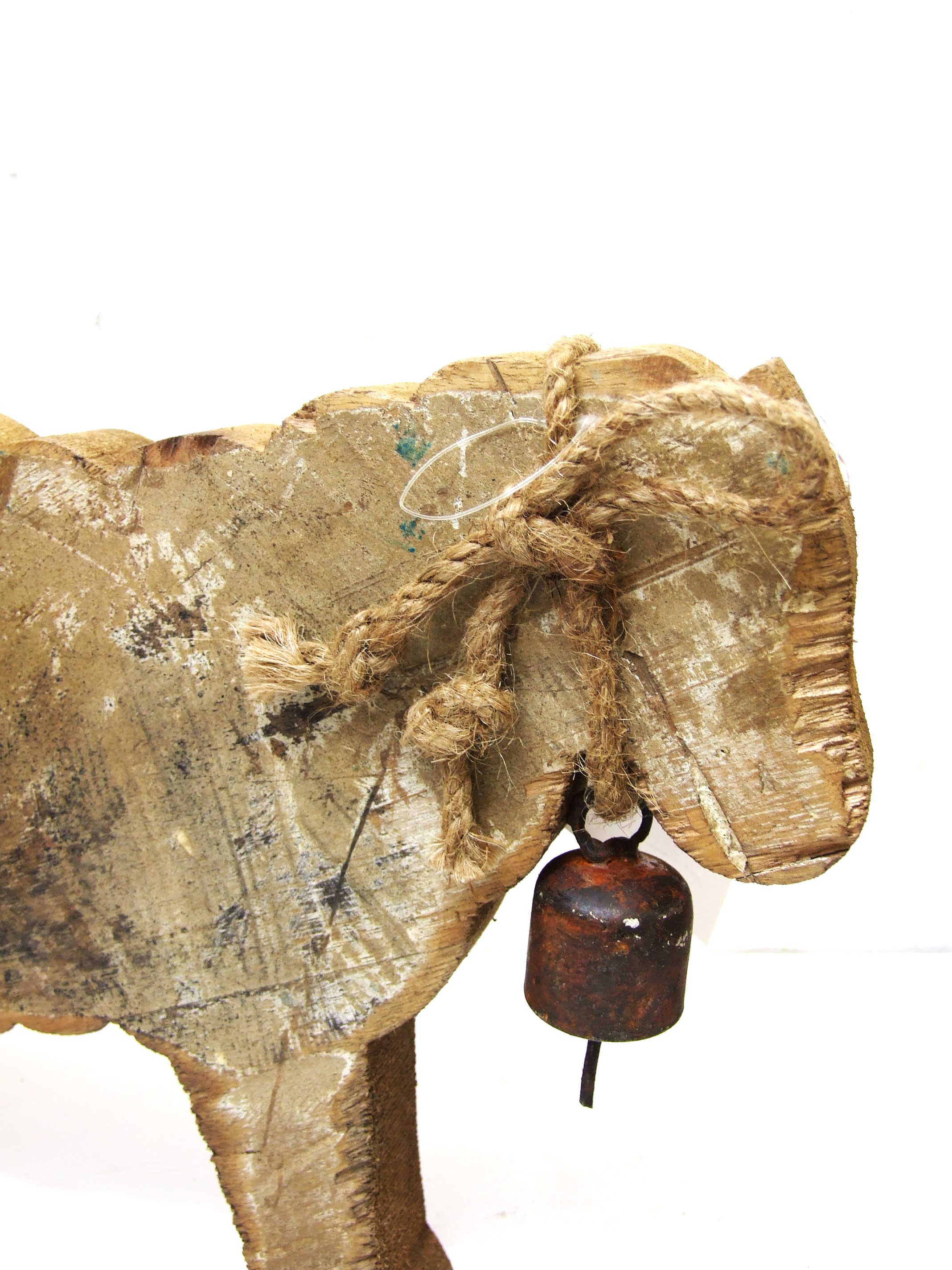 Dekoracyjny baran ze starego drewna z dzwoneczkiem i sznurkiem na szyi.