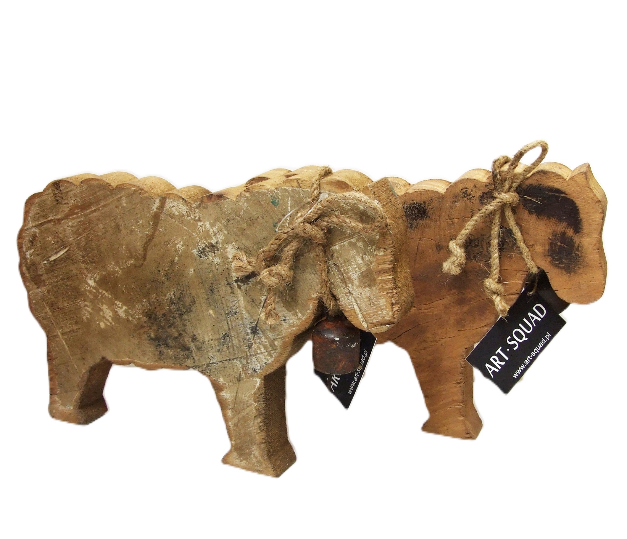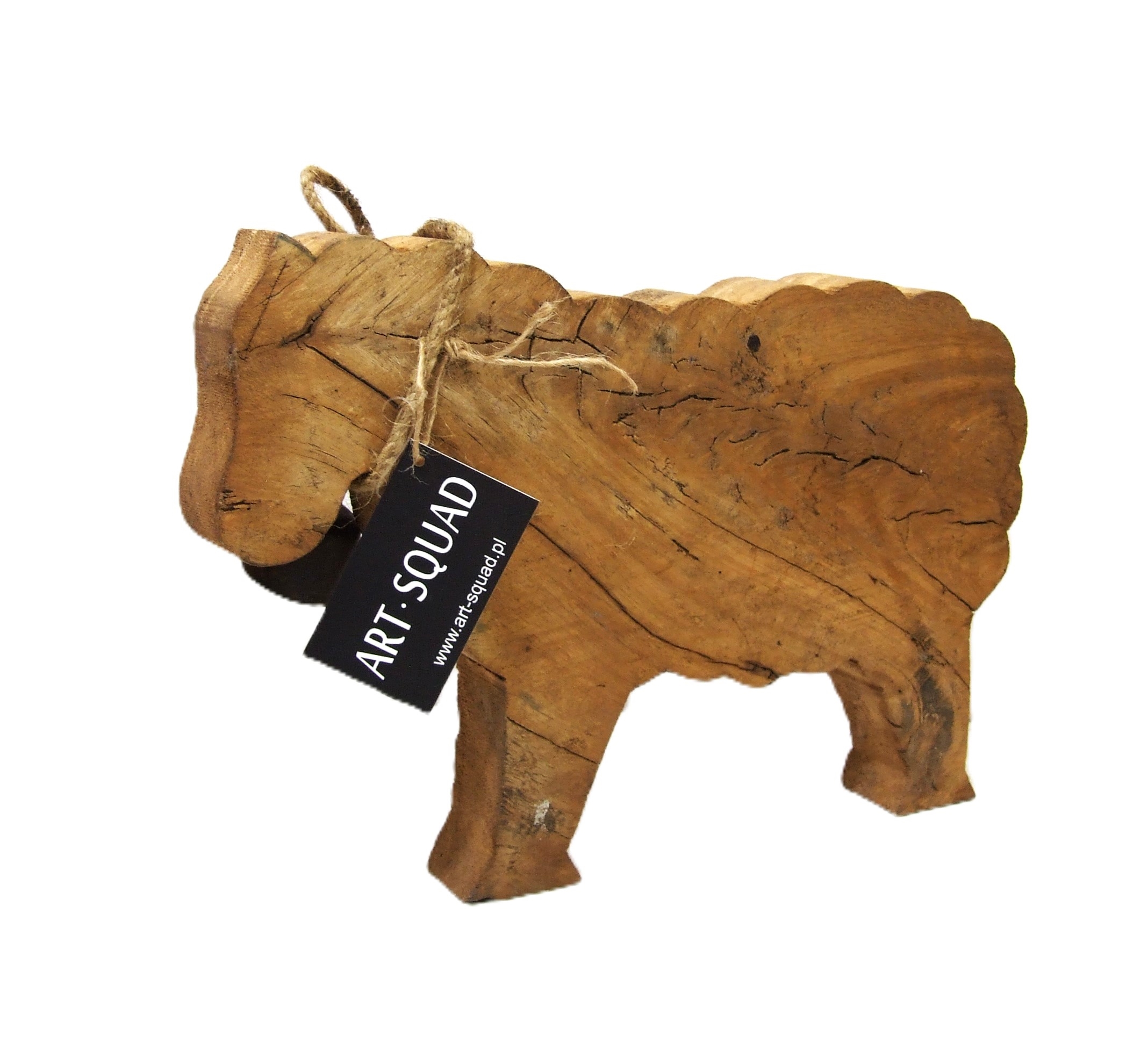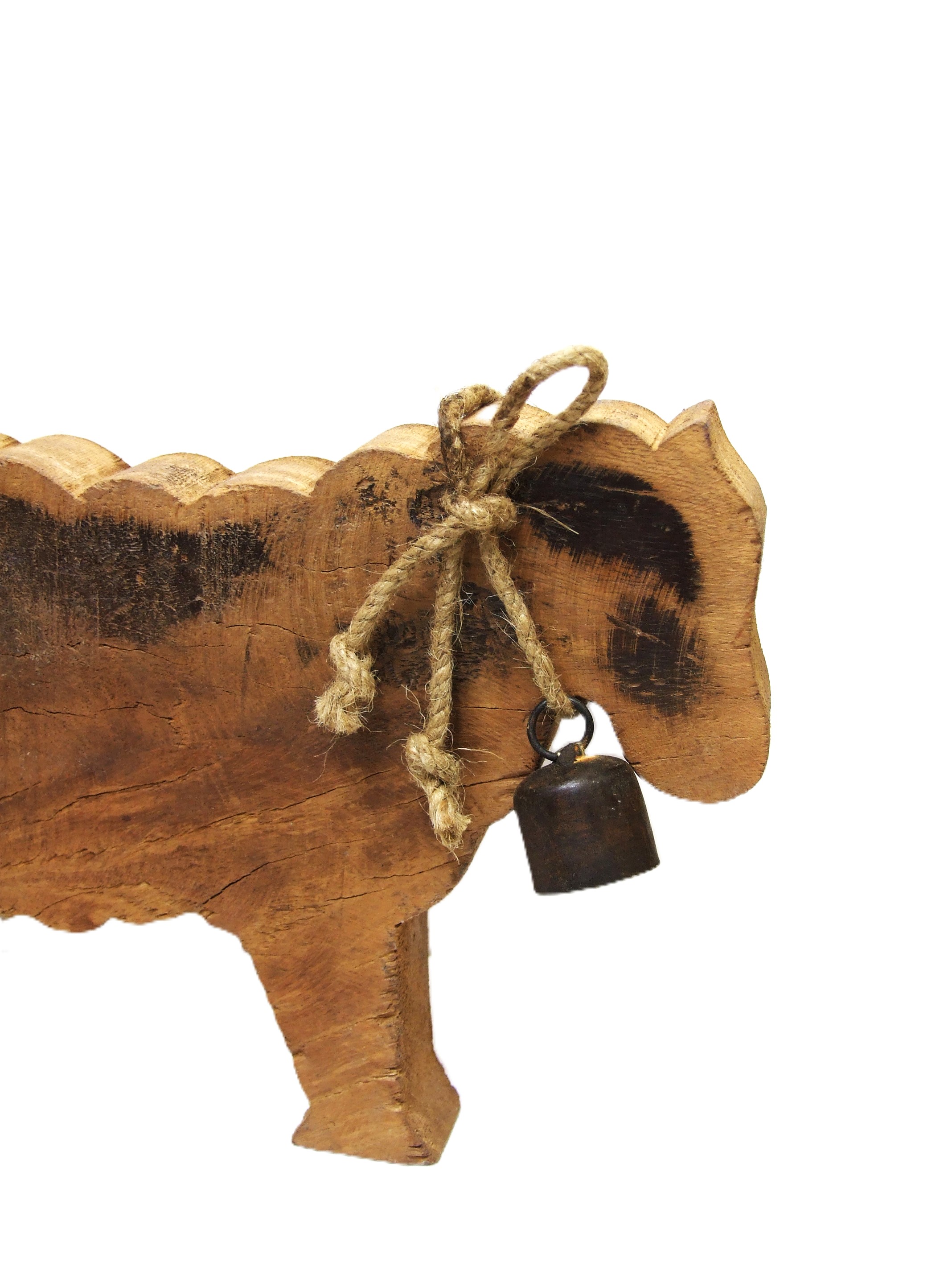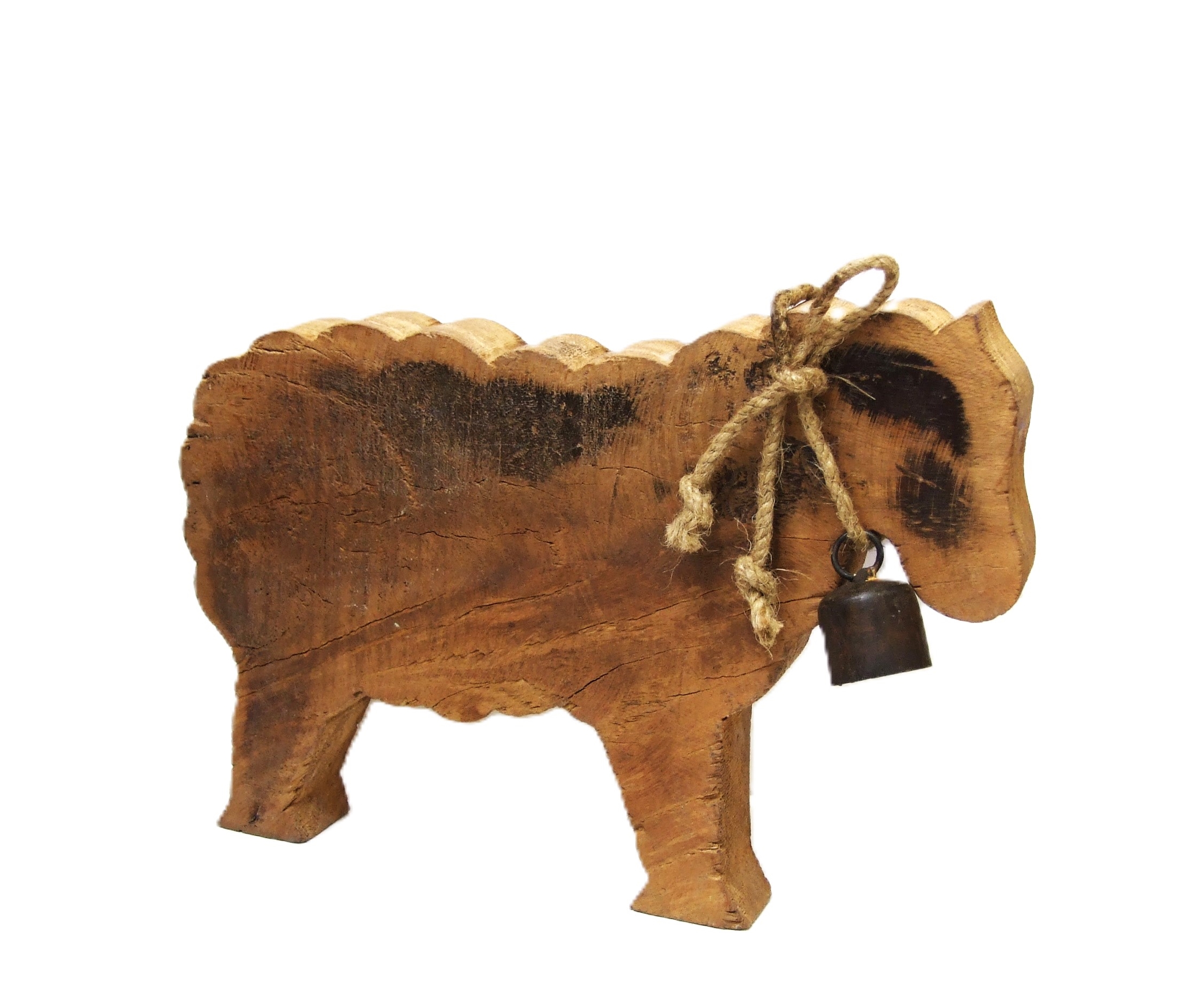 Dekoracyjny baran ze starego drewna z dzwoneczkiem i sznurkiem na szyi.