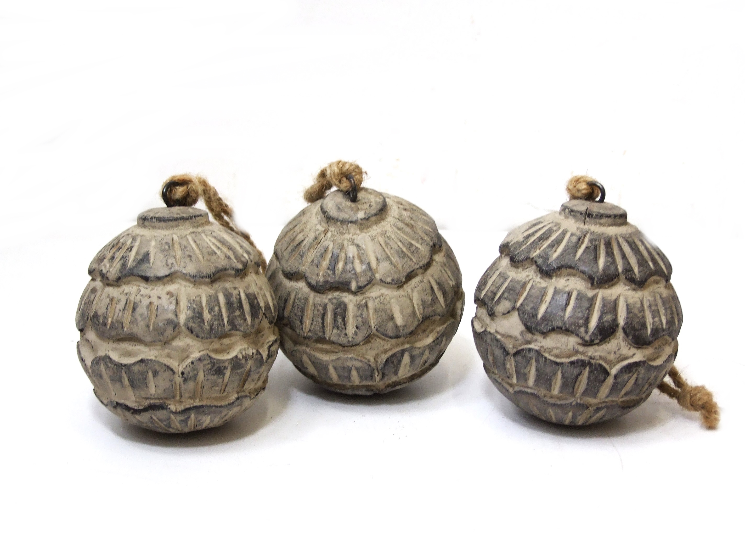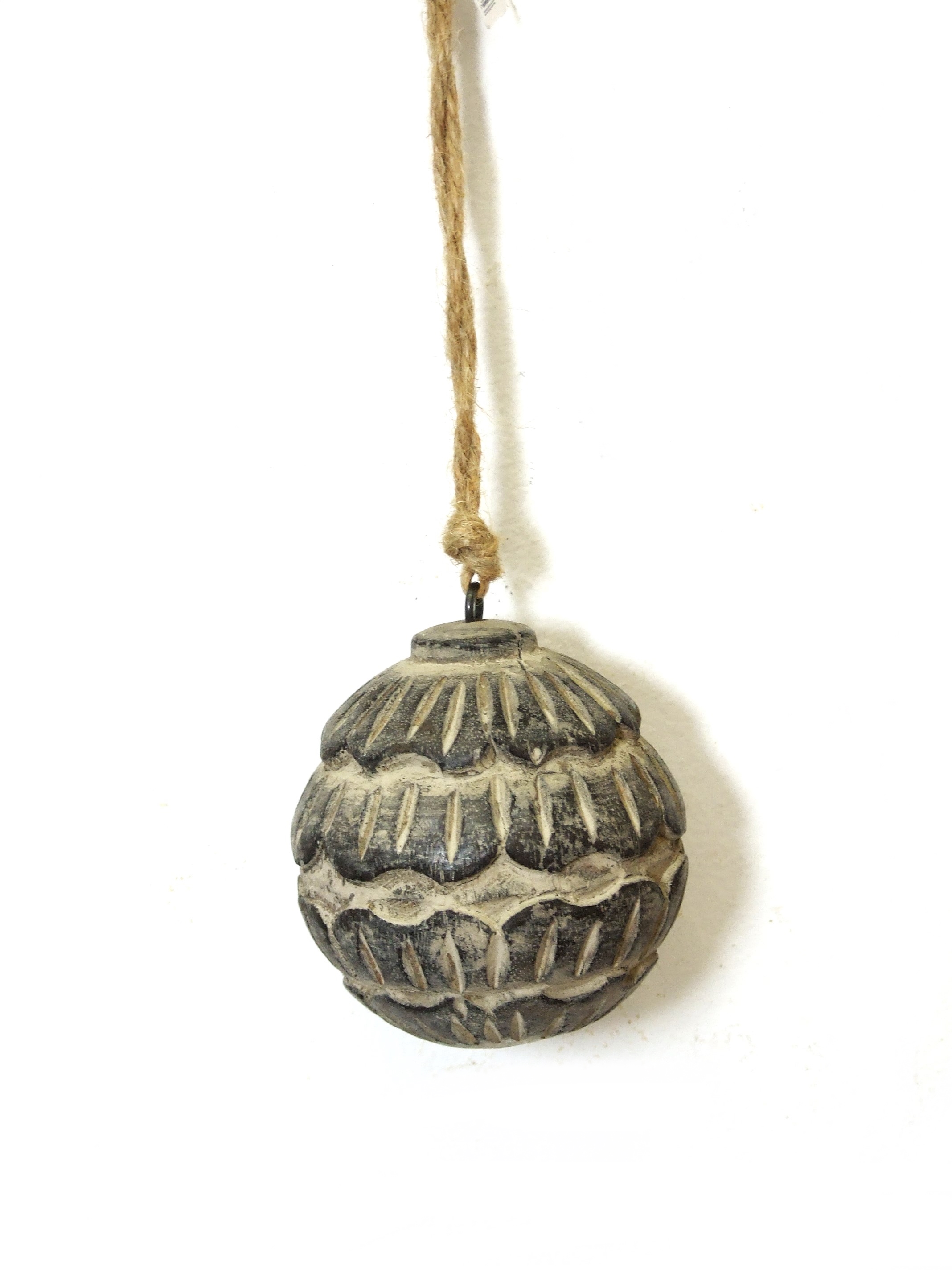 Piękna świąteczna drewniana bombka, zawieszona na jutowym sznurku.