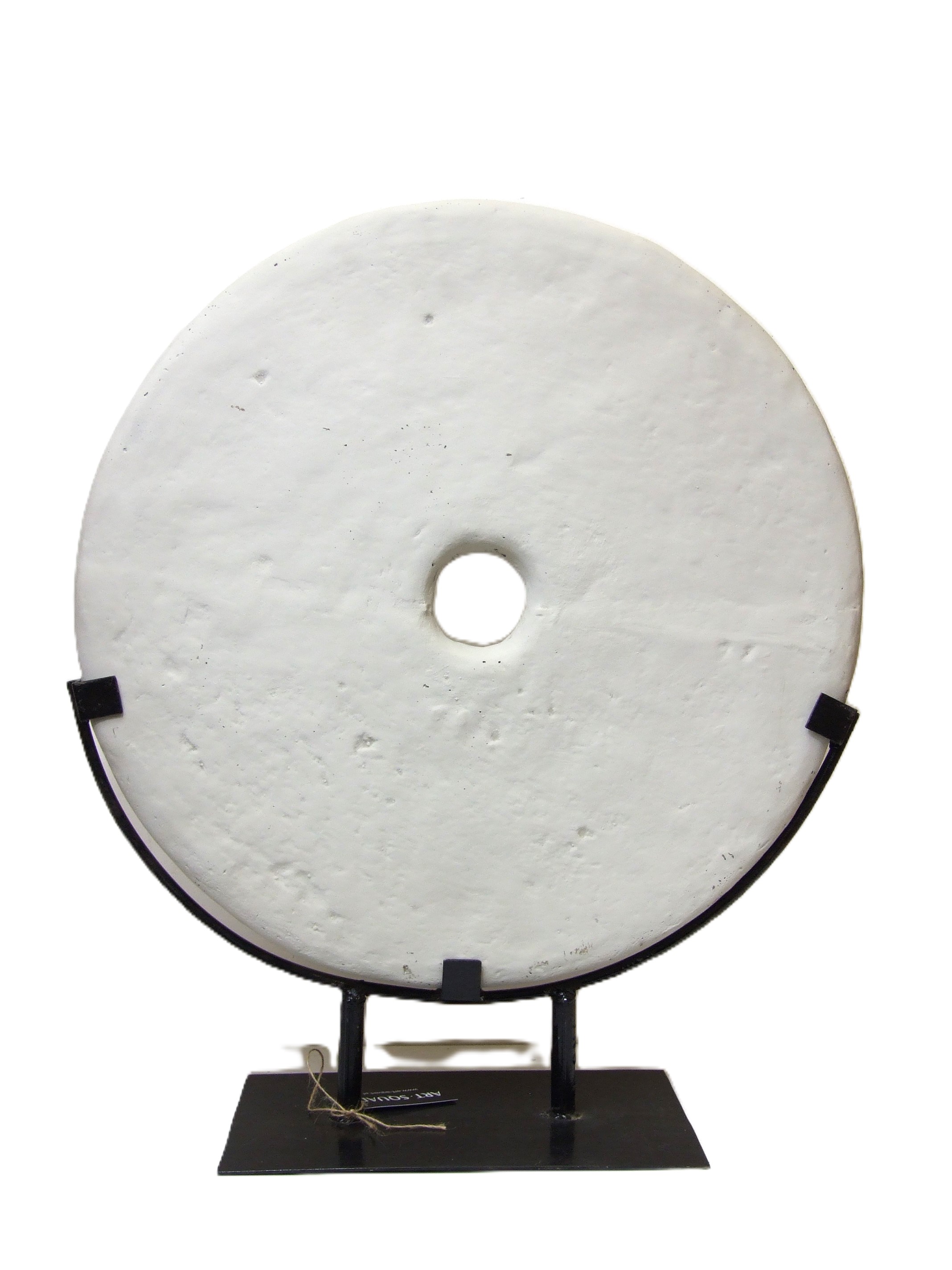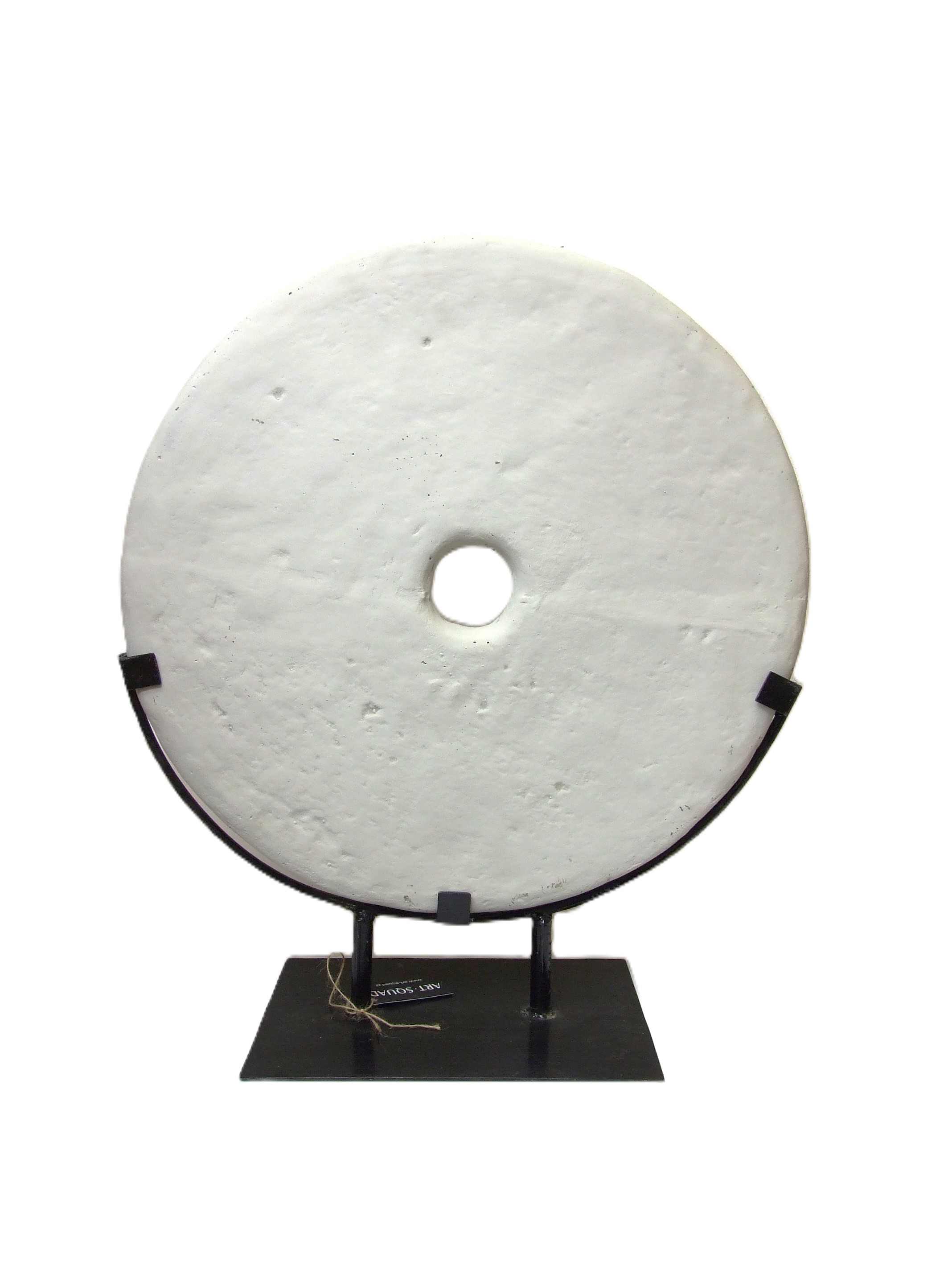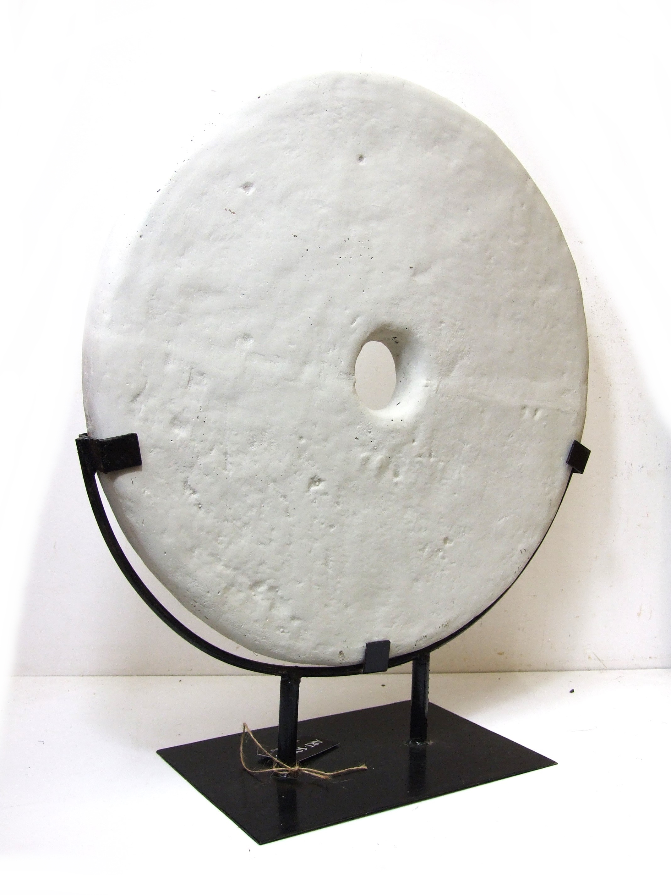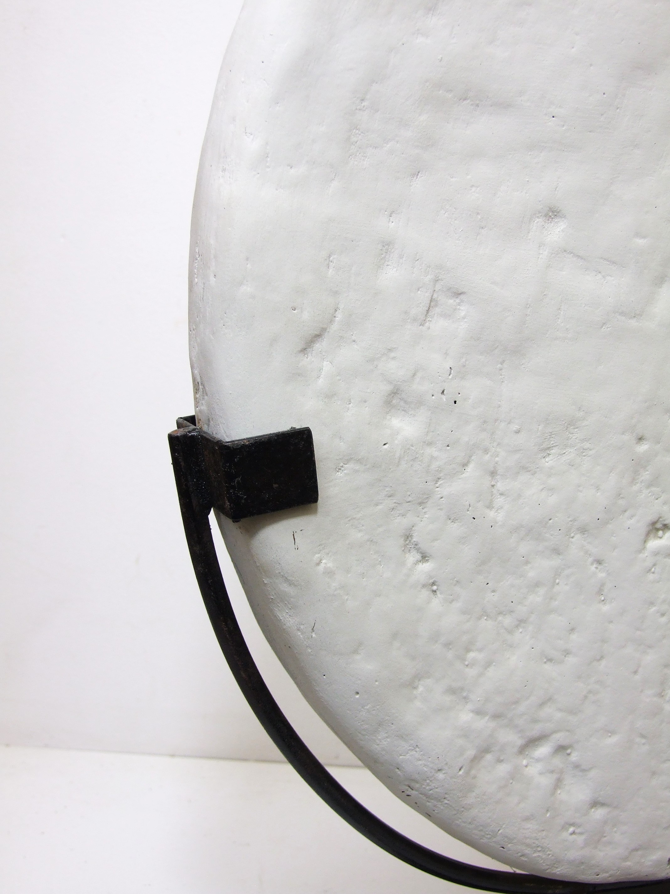 Dekoracja w formie koła, wykonana z betonu na metalowej podstawie.