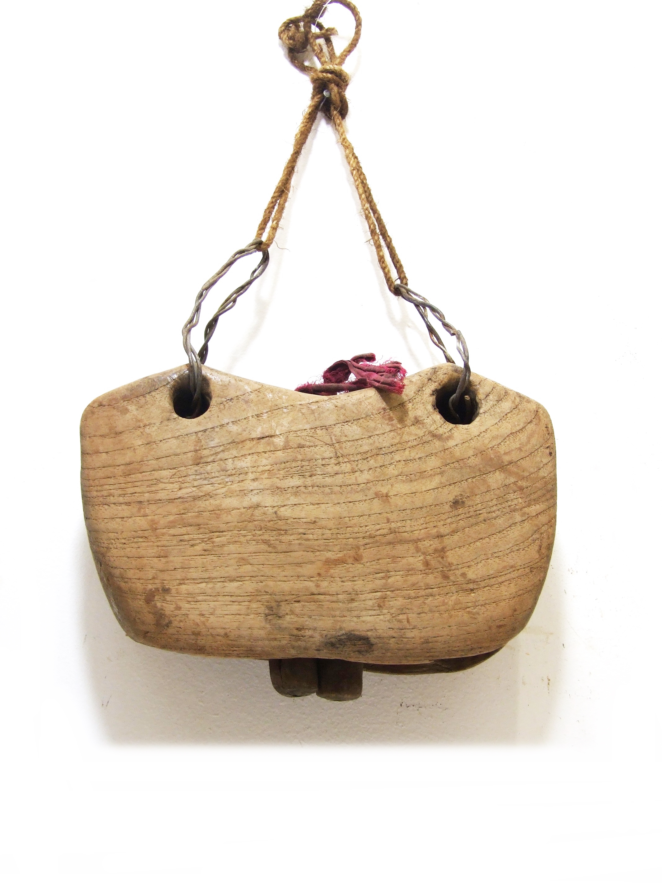 Stare egzotyczne drewno zawieszone na grubym jutowym sznurze z drewnianym sercem w środku.