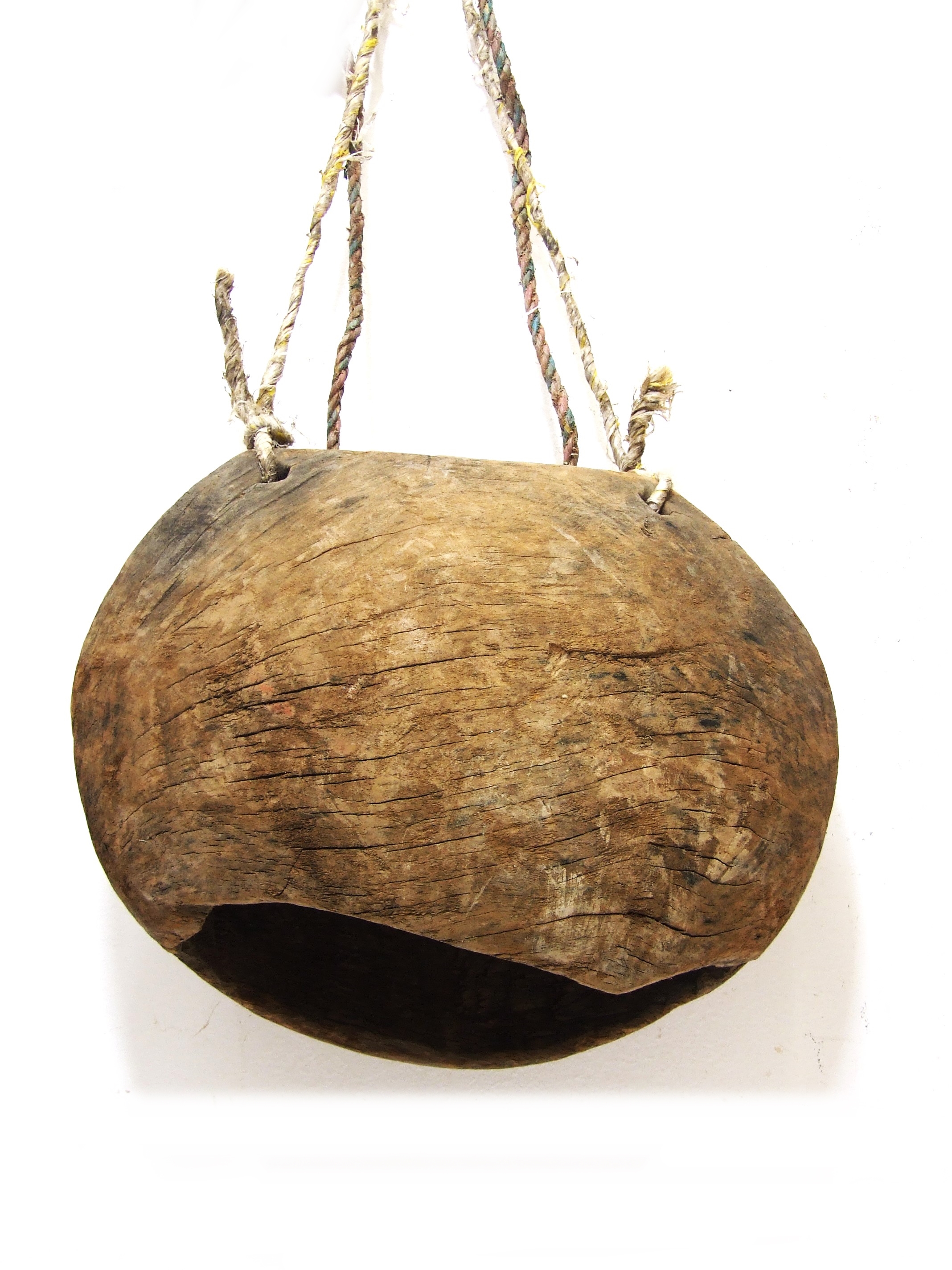 Stare egzotyczne drewno zawieszone na grubym jutowym sznurze z drewnianym sercem w środku.