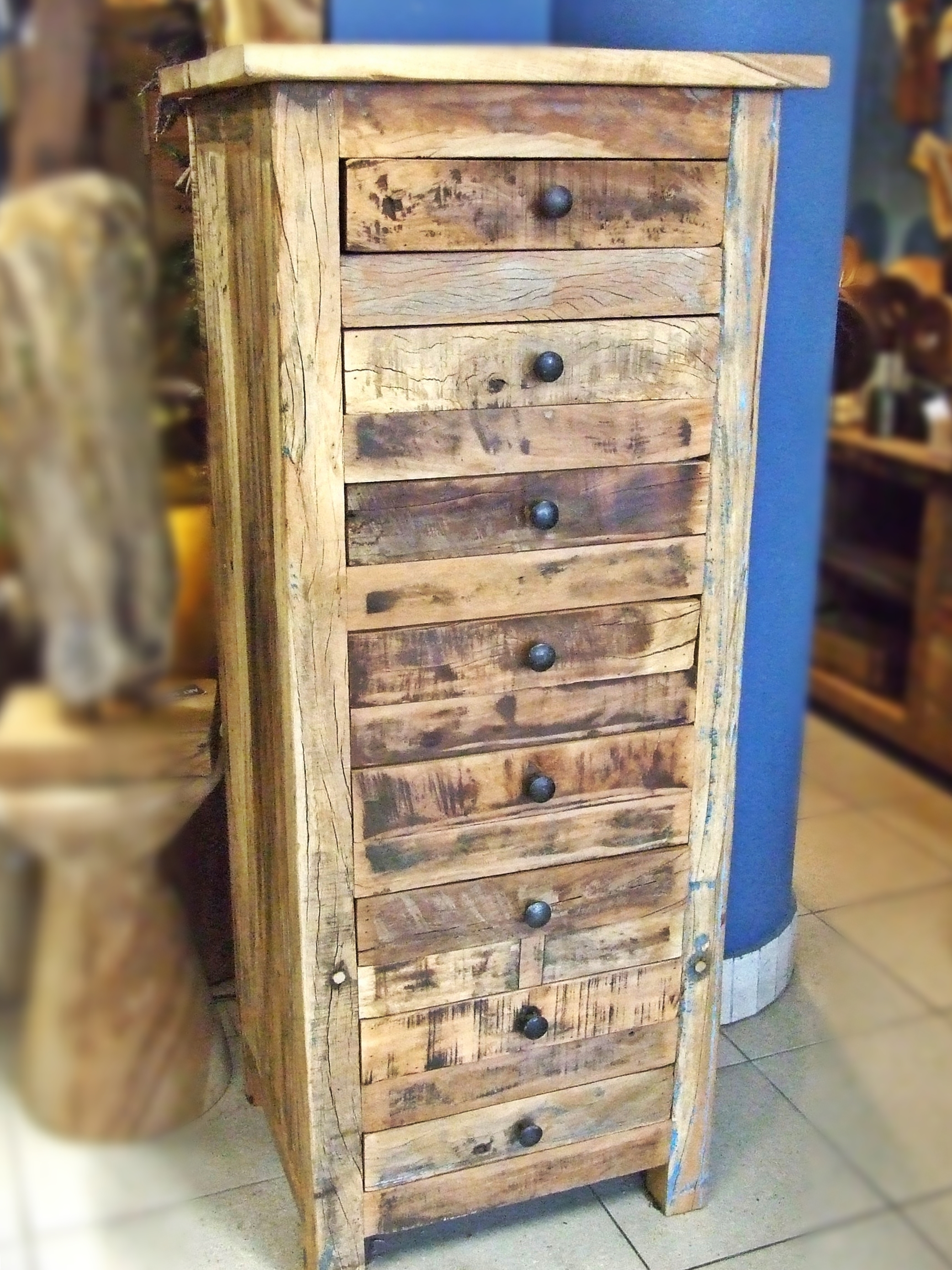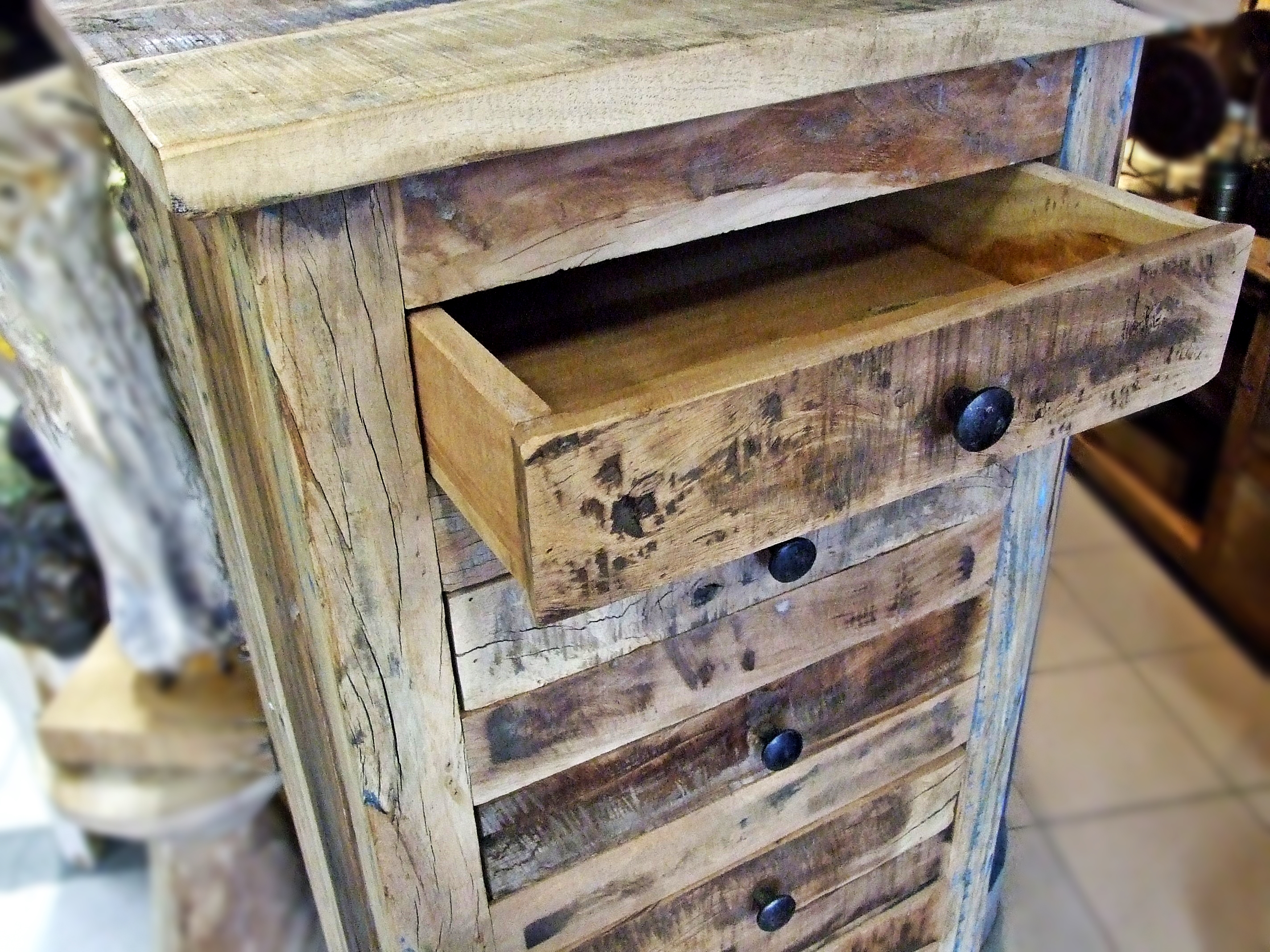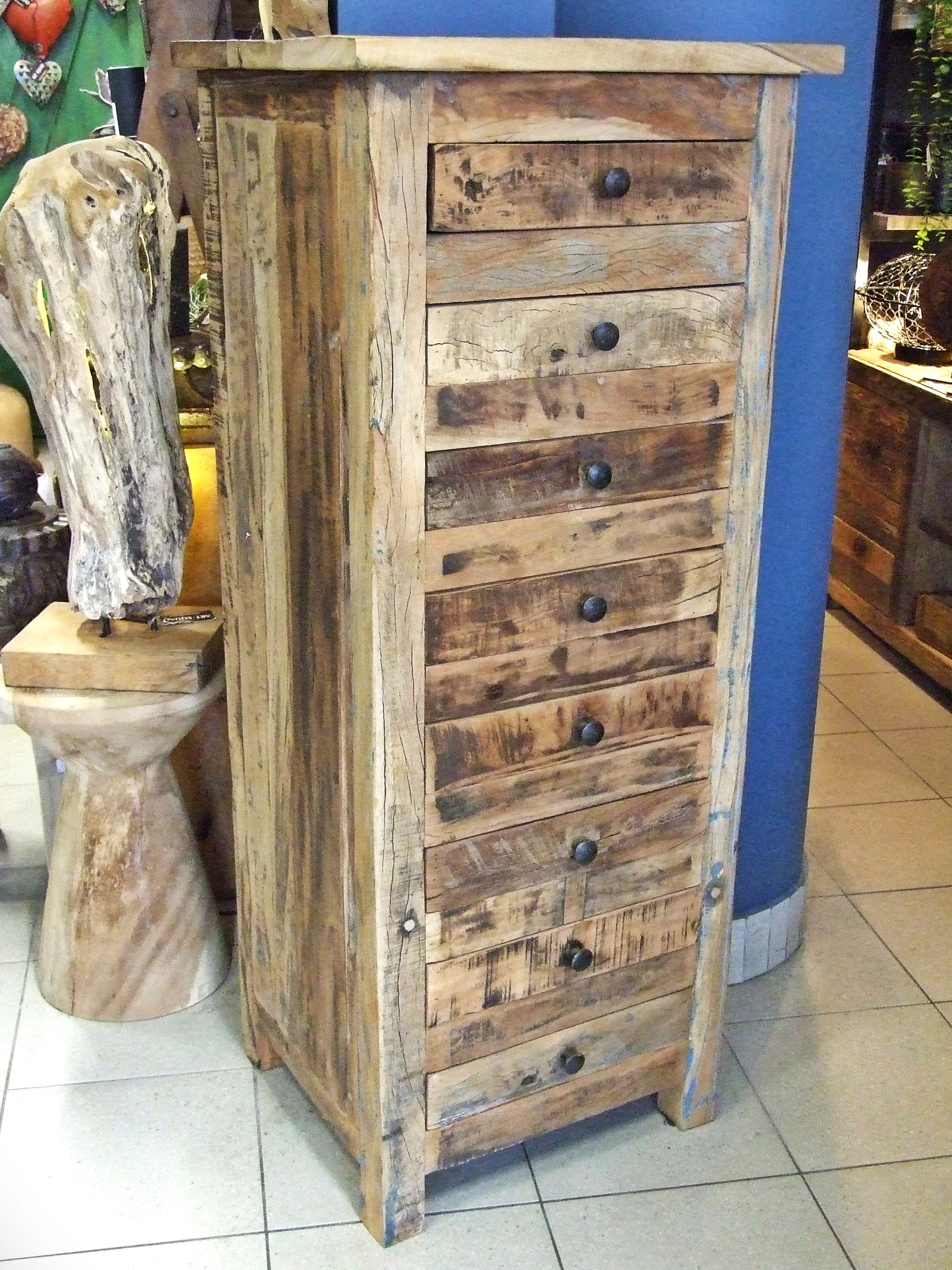 Stylowa i funkcjonalna wysoka komoda wykonana z drewna egzotycznego z recyclingu.