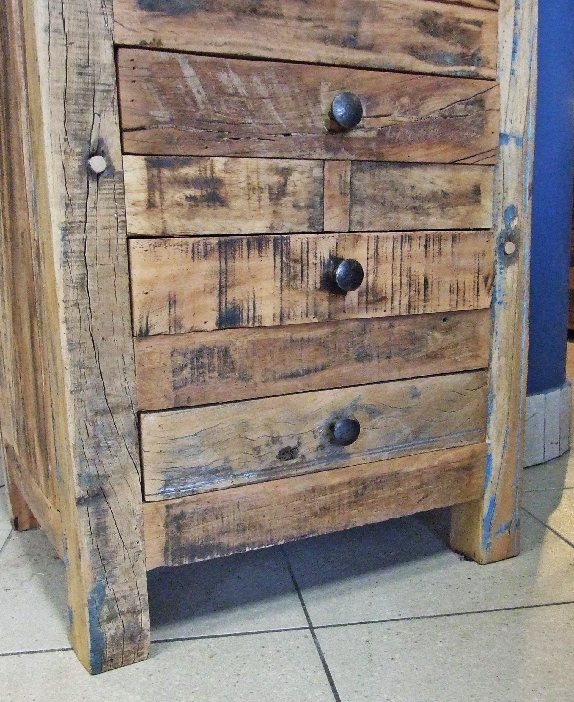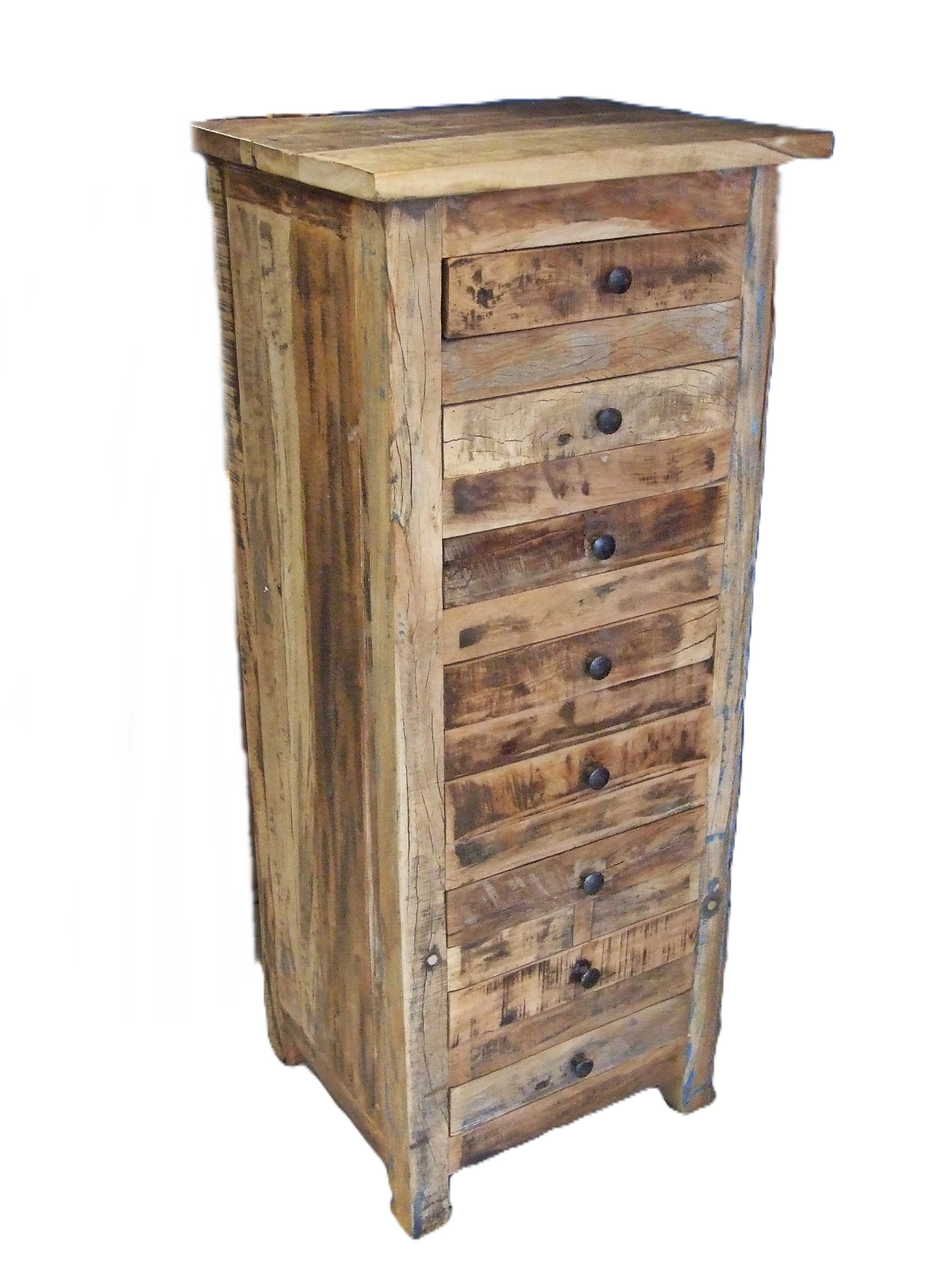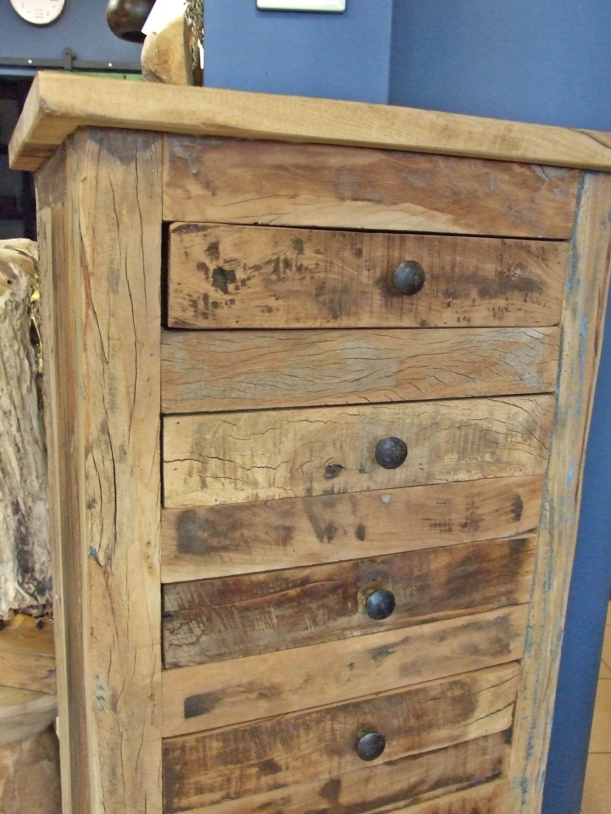 Stylowa i funkcjonalna wysoka komoda wykonana z drewna egzotycznego z recyclingu.