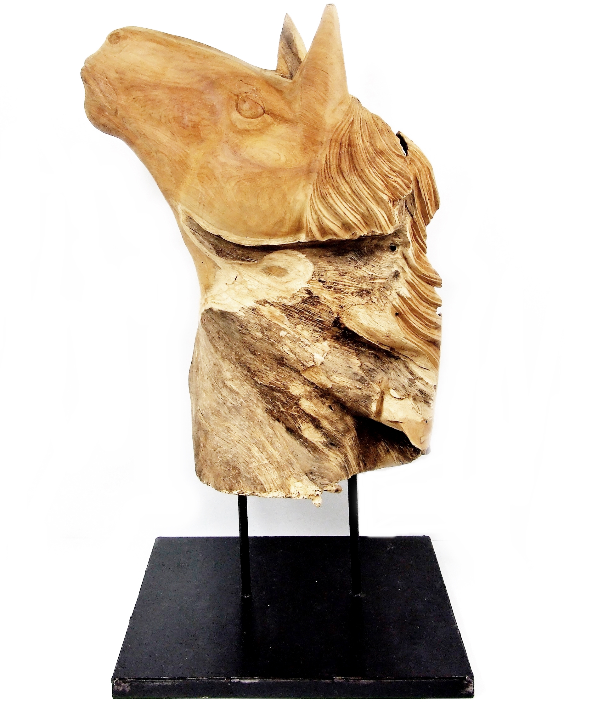 Głowa Konia - rzeźba wykonana z drewna tekowego umieszczona na metalowej podstawie.