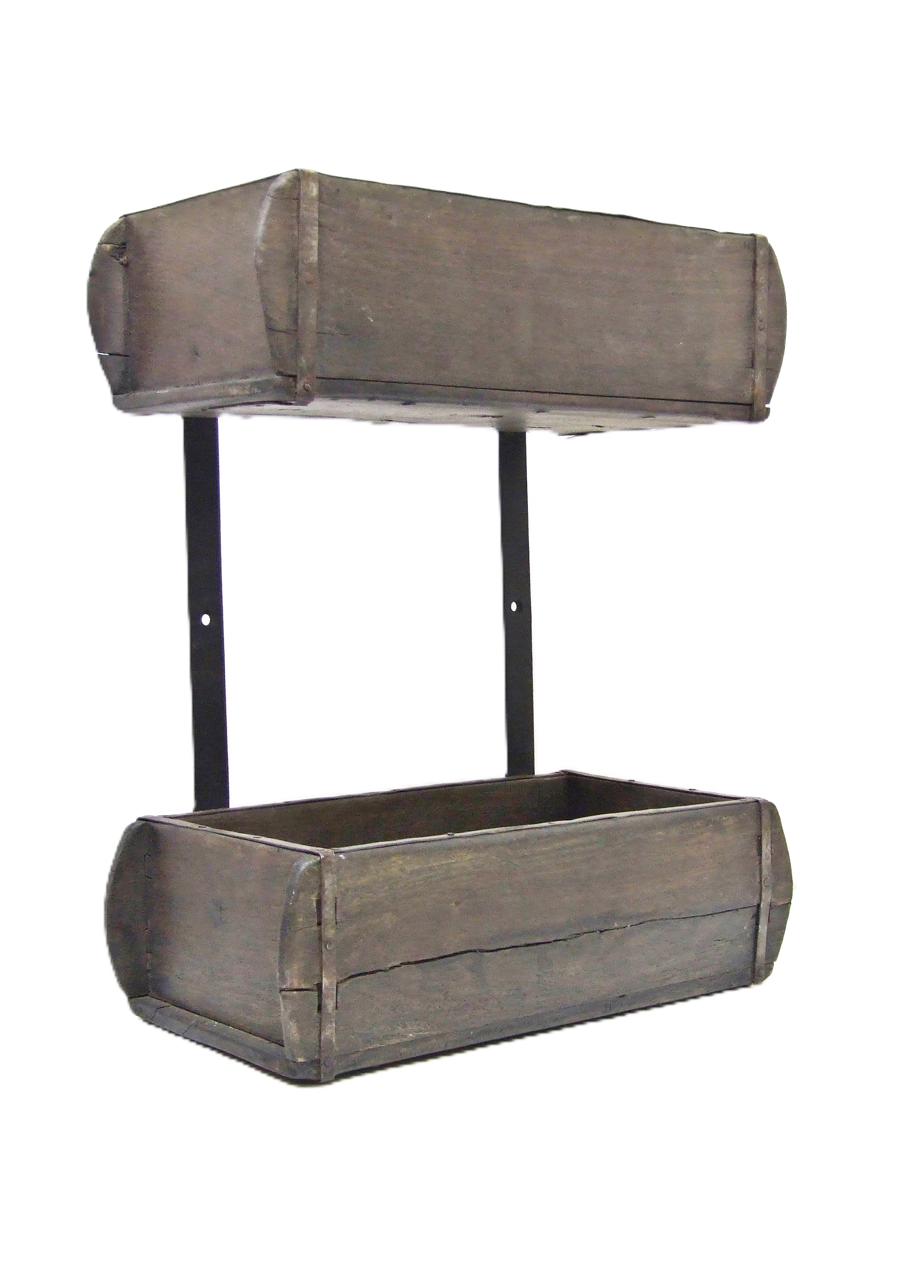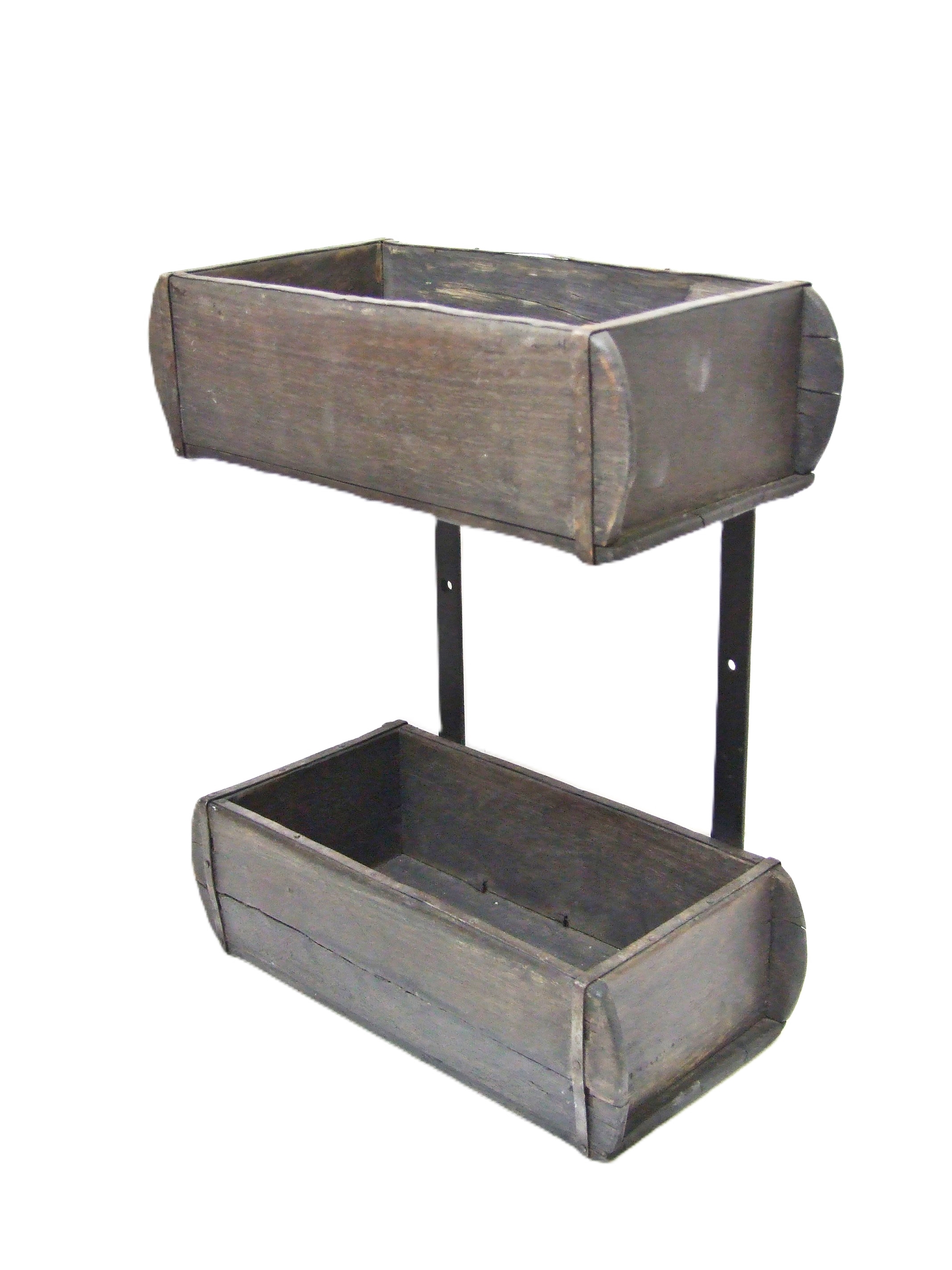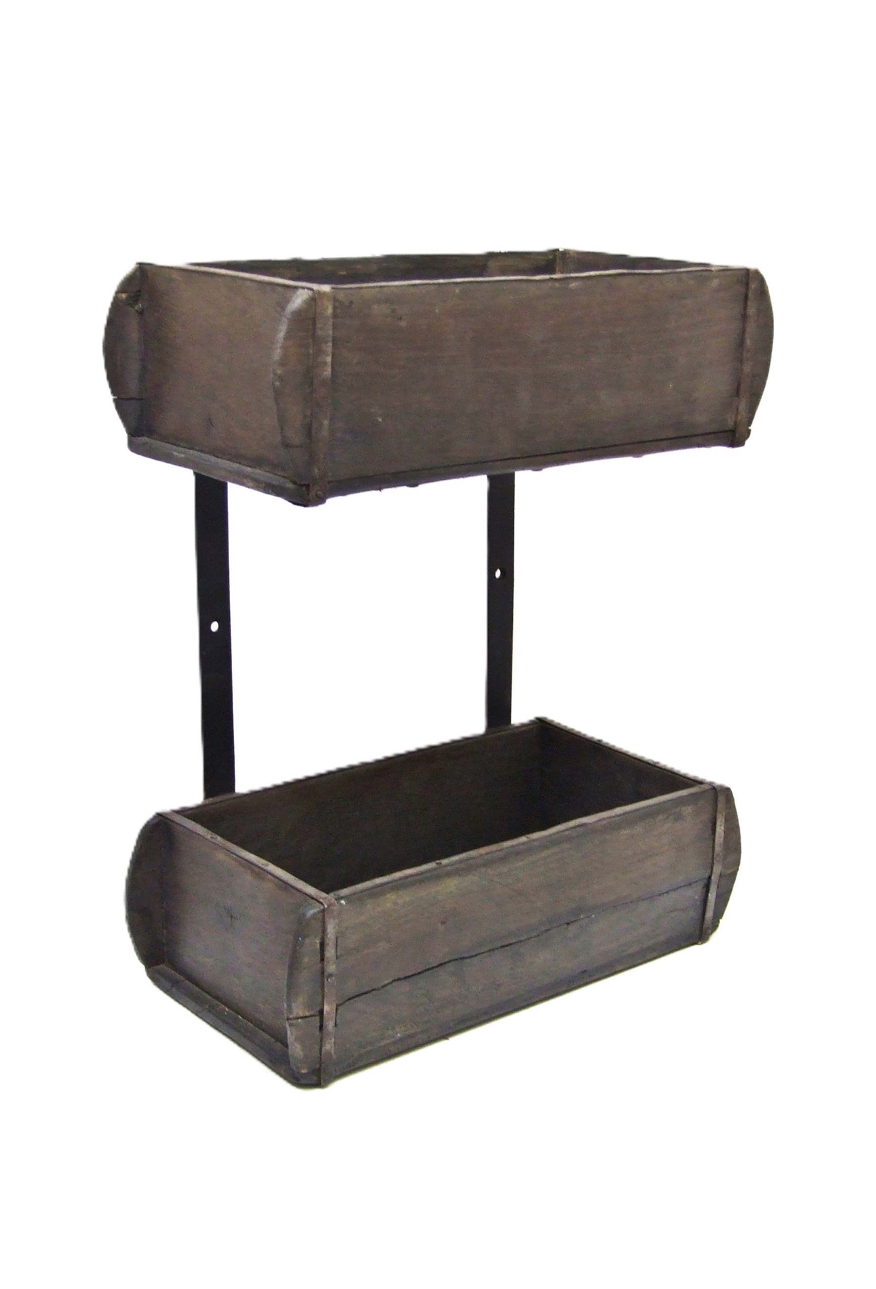 Posiadająca dwie otwarte szufladki, wykończona metalowymi, postarzanymi elementami. Drewno w starej surowej wersji, zachowane elementy starej farby które nadają półce charakter.