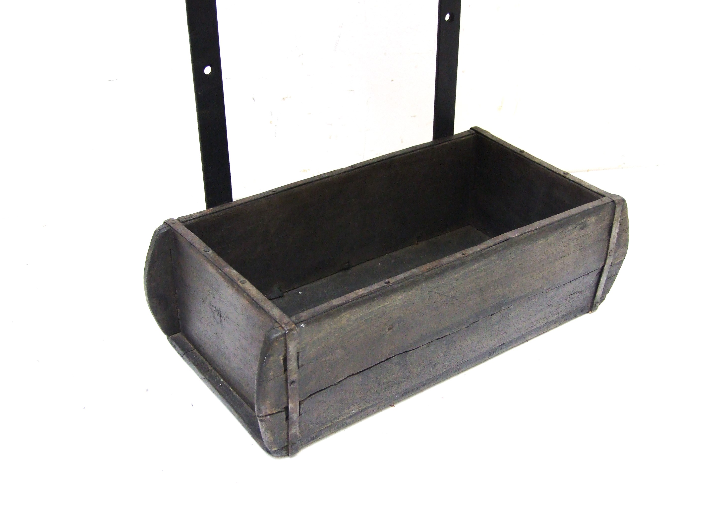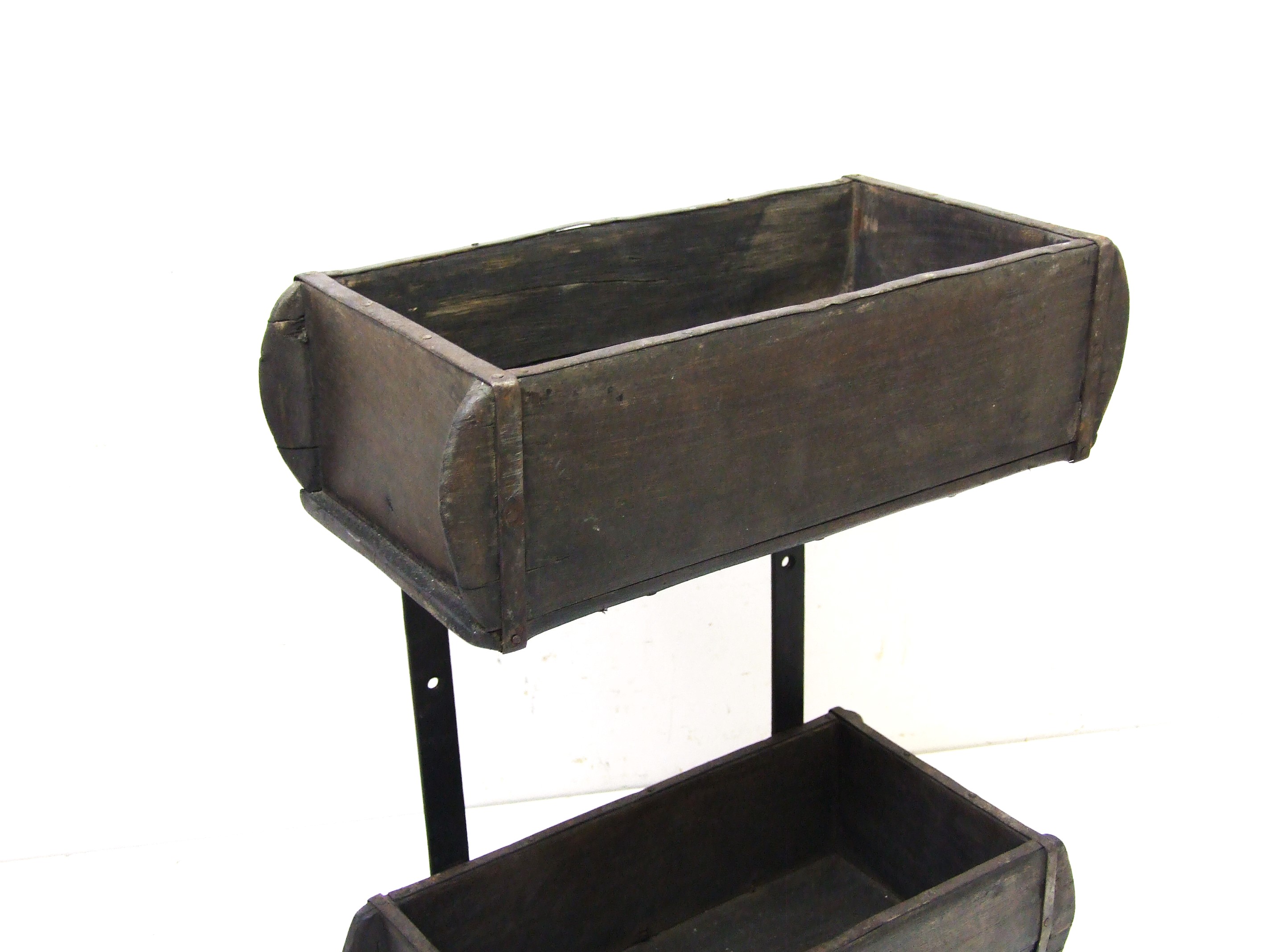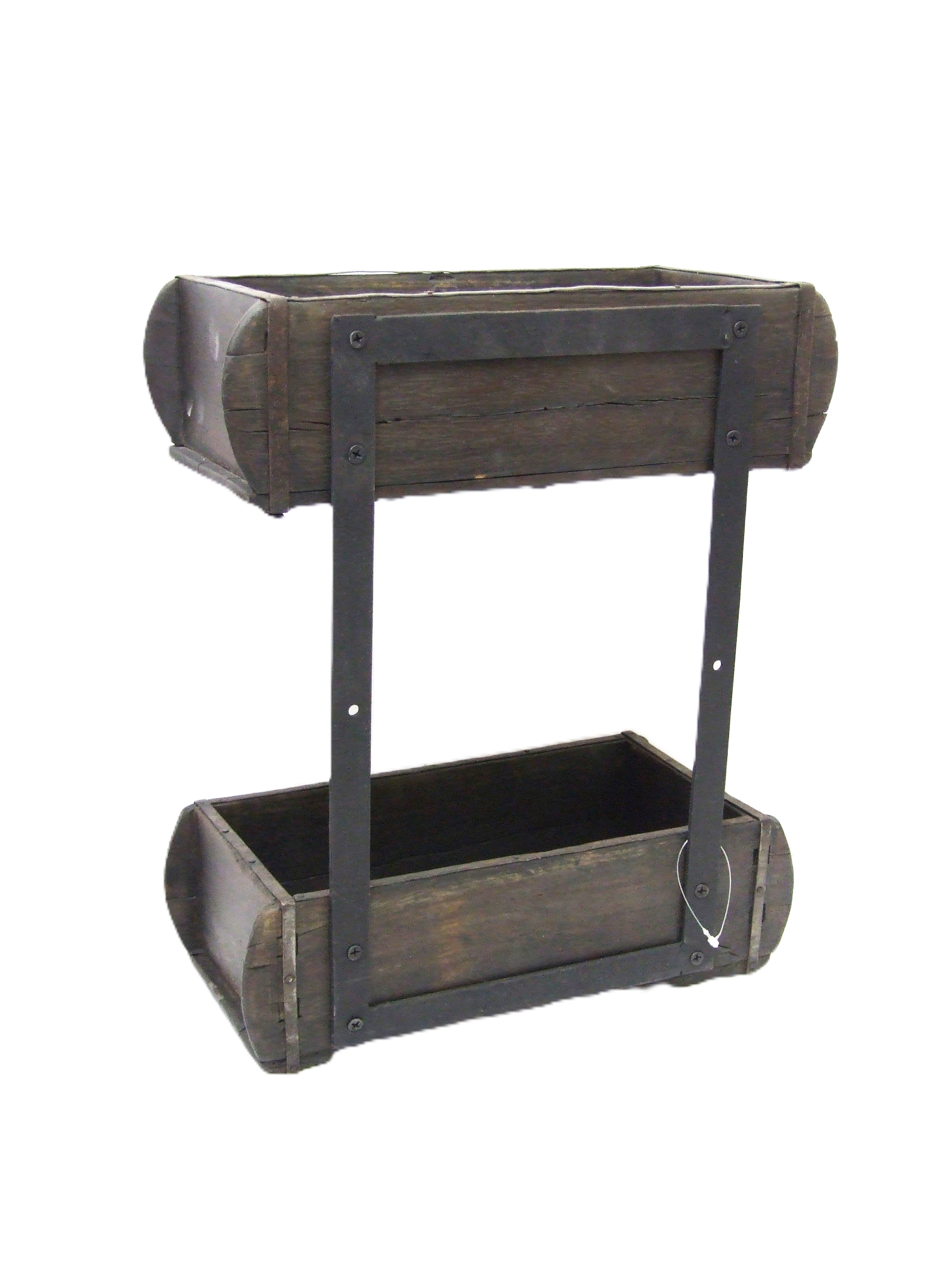 Posiadająca dwie otwarte szufladki, wykończona metalowymi, postarzanymi elementami. Drewno w starej surowej wersji, zachowane elementy starej farby które nadają półce charakter.