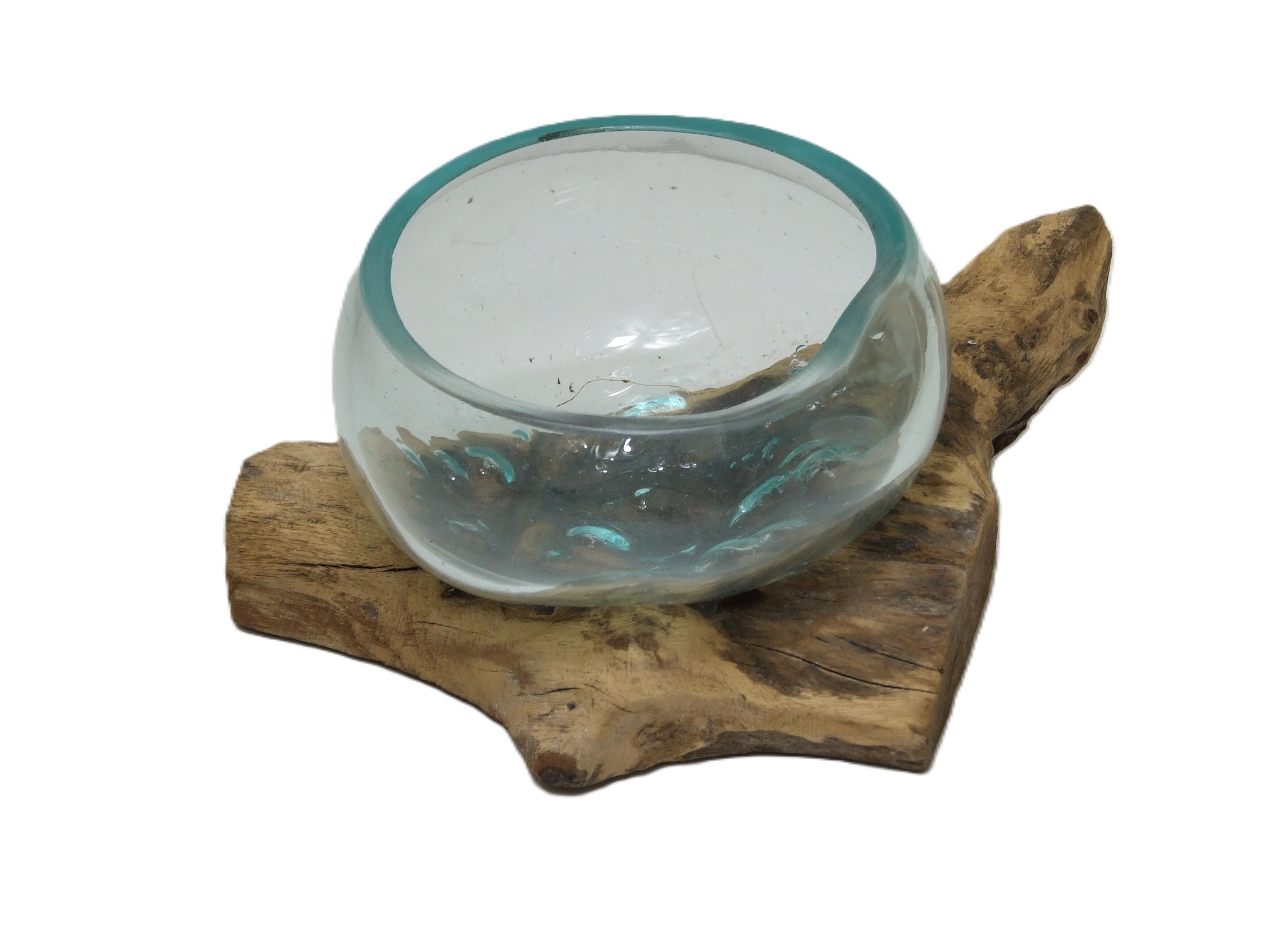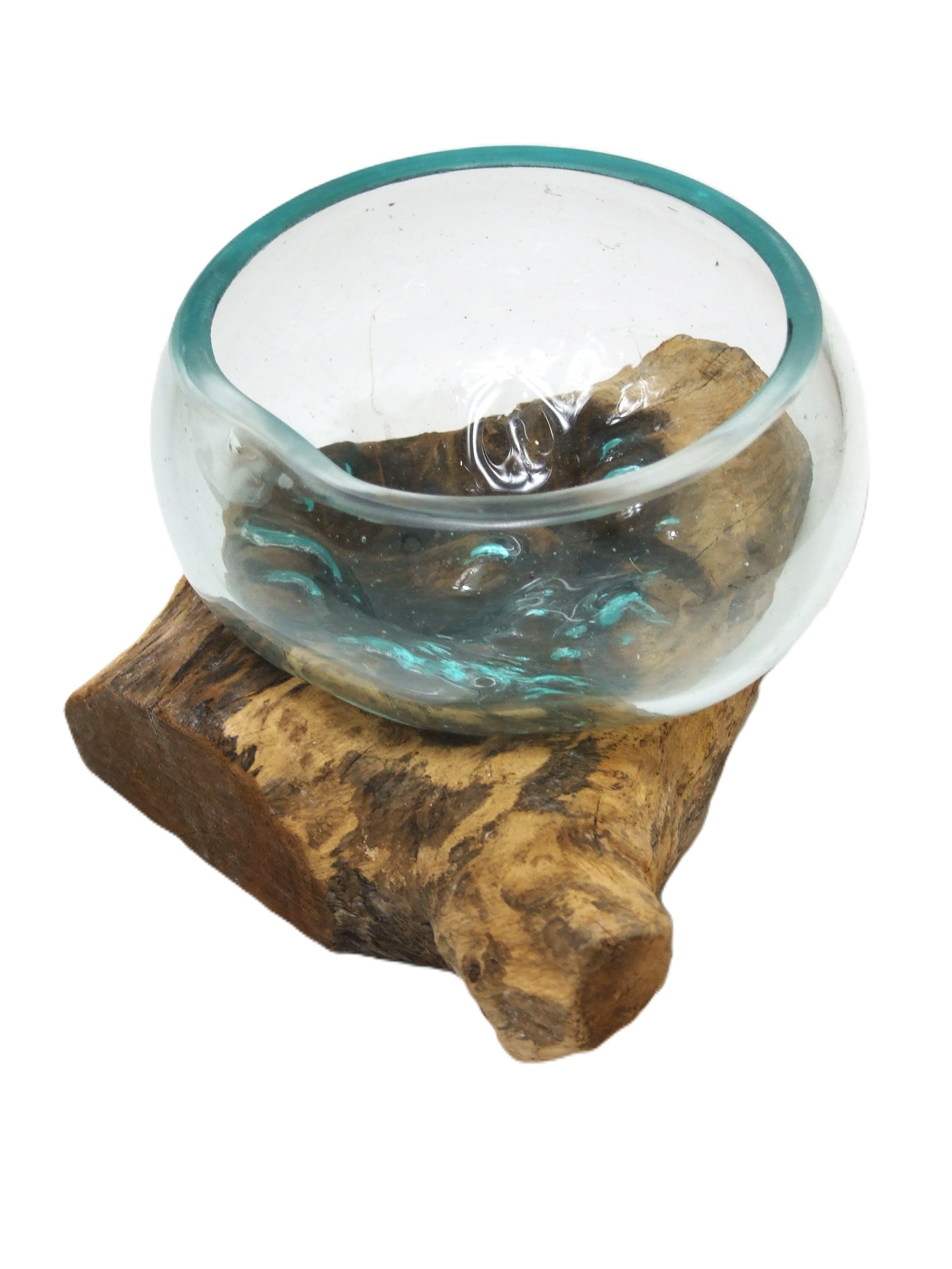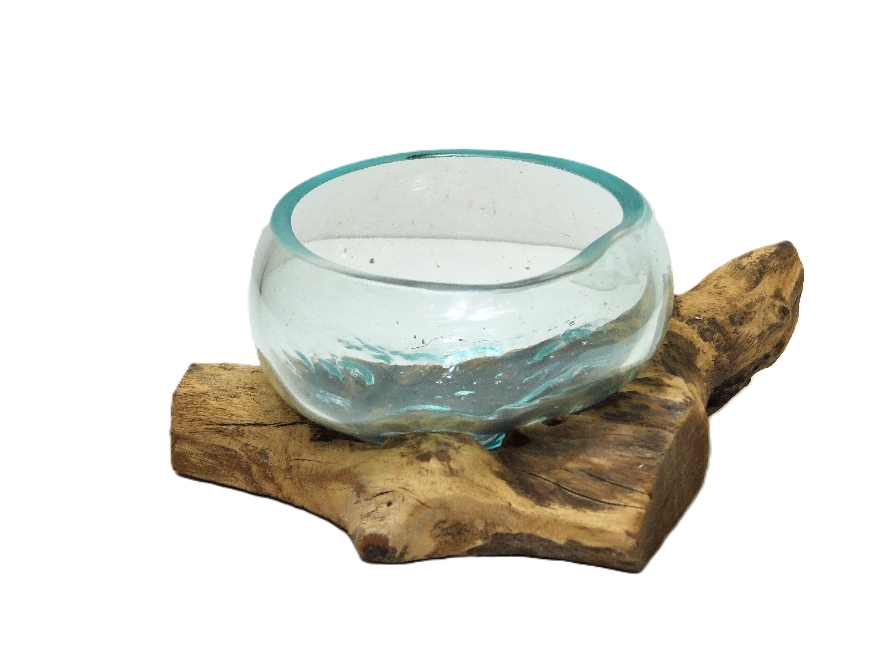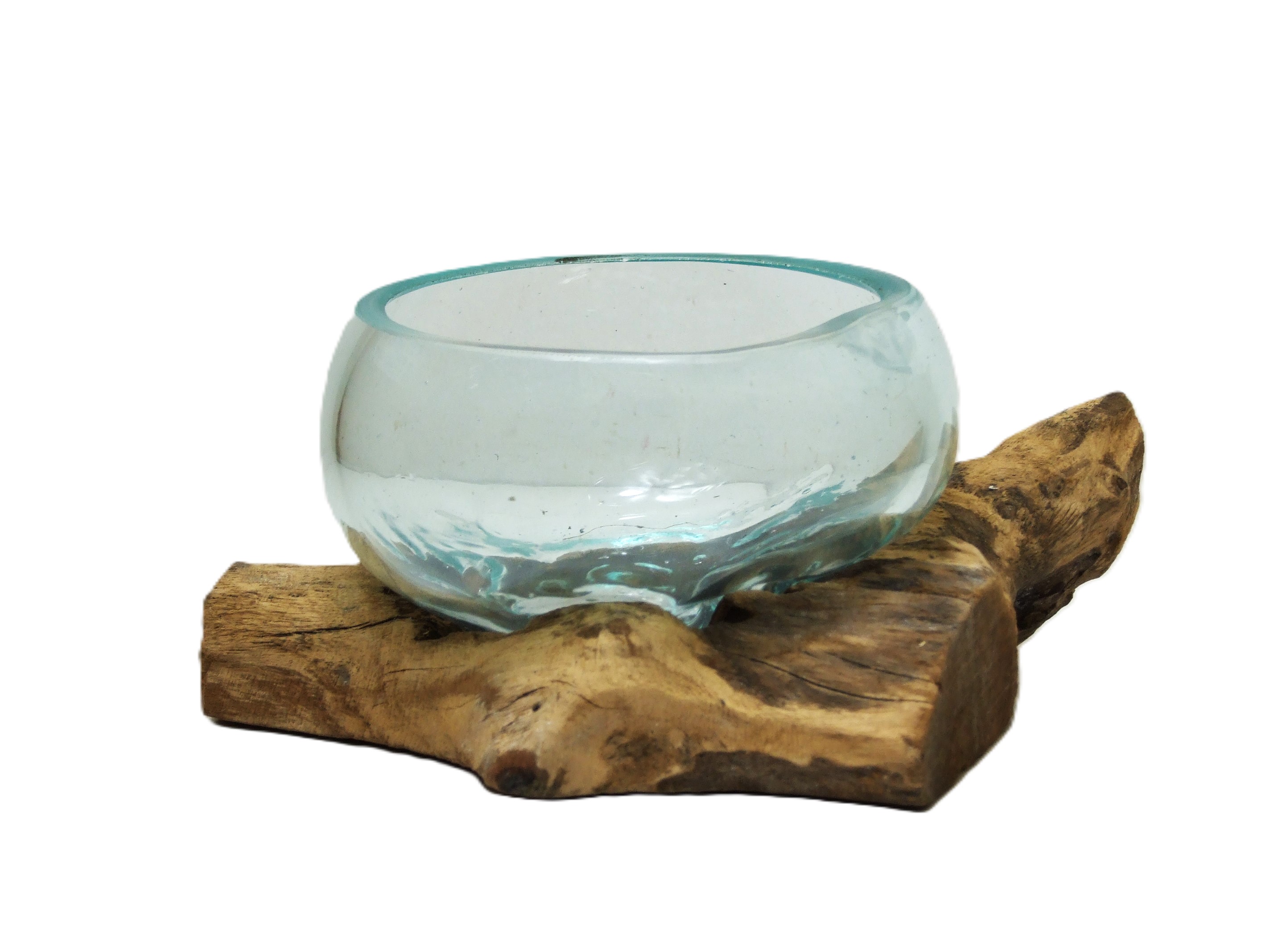 Piękny wyjątkowo oryginalny świecznik wykonany z szkła mocowanego w drewnie. Szklany pojemnik jest idealnie dopasowany do indywidualnego kawałka drewna, zatapia się w nim.