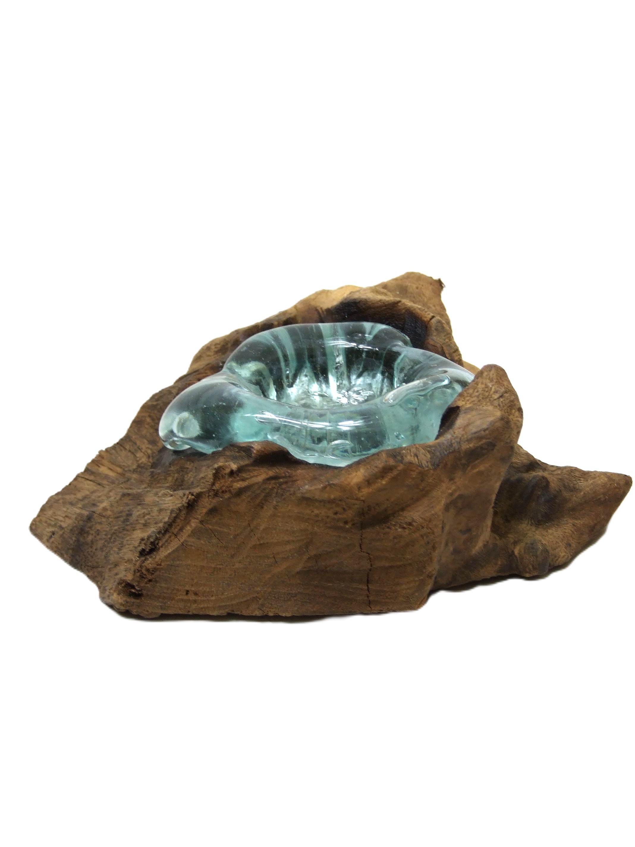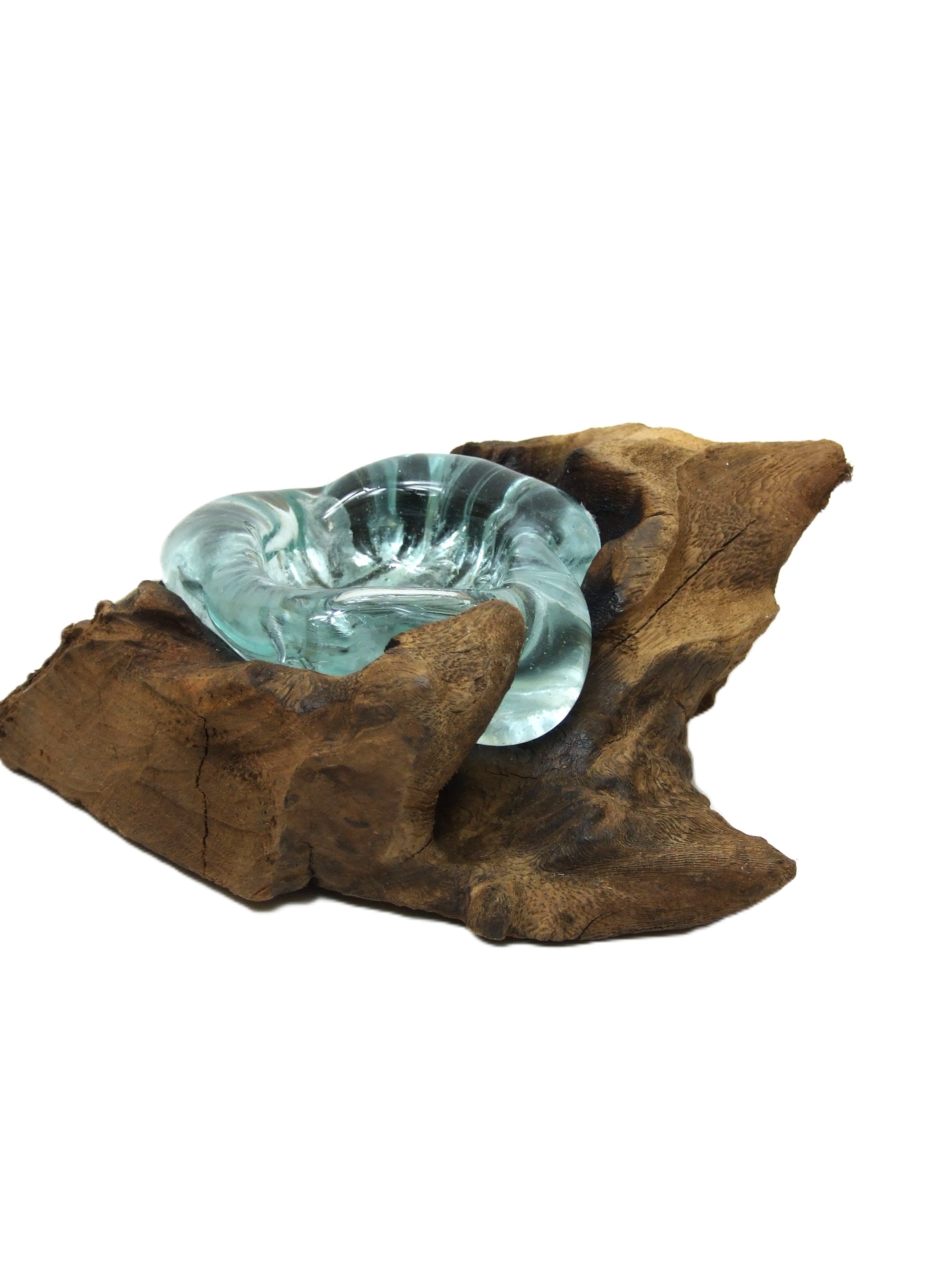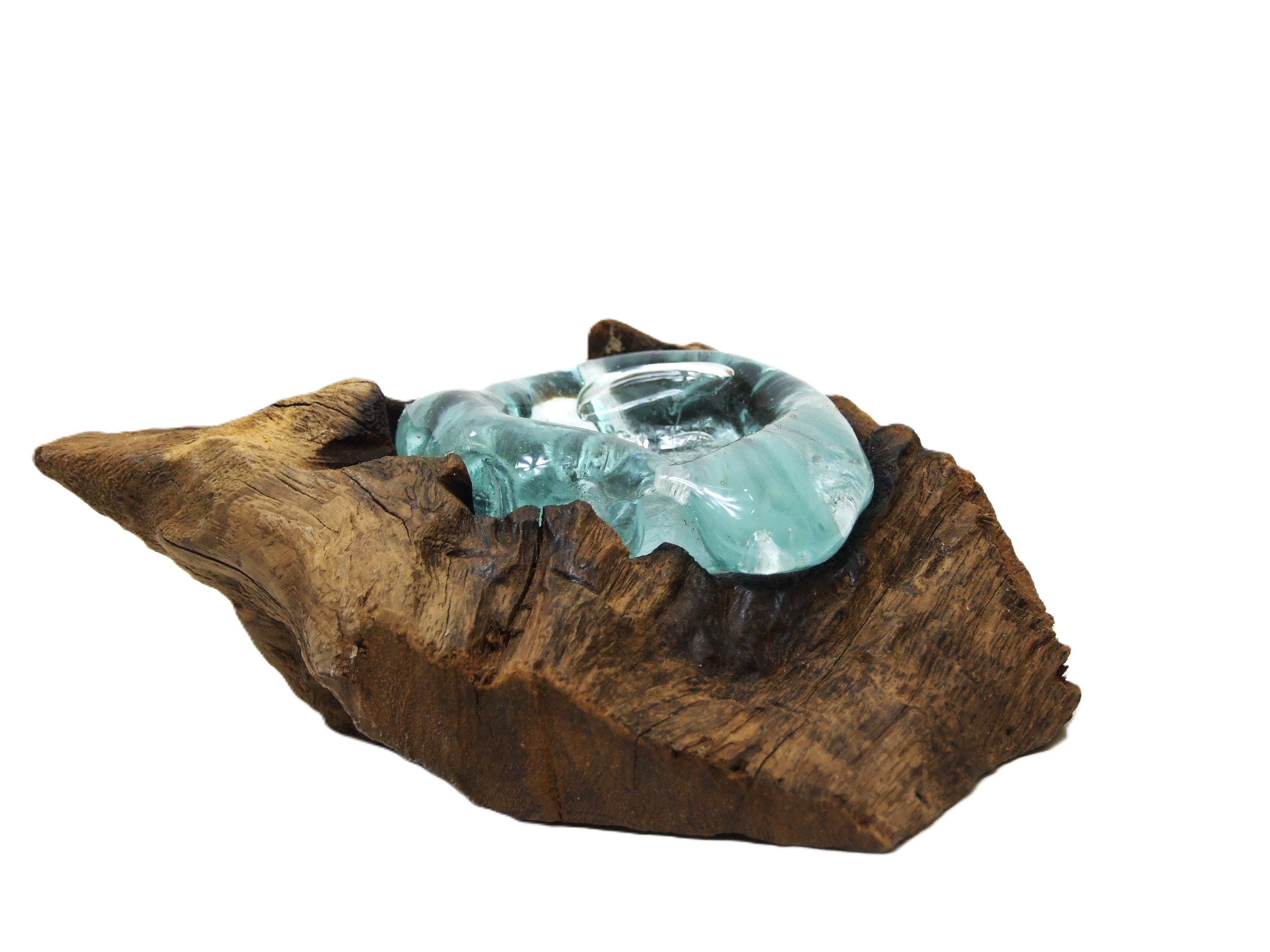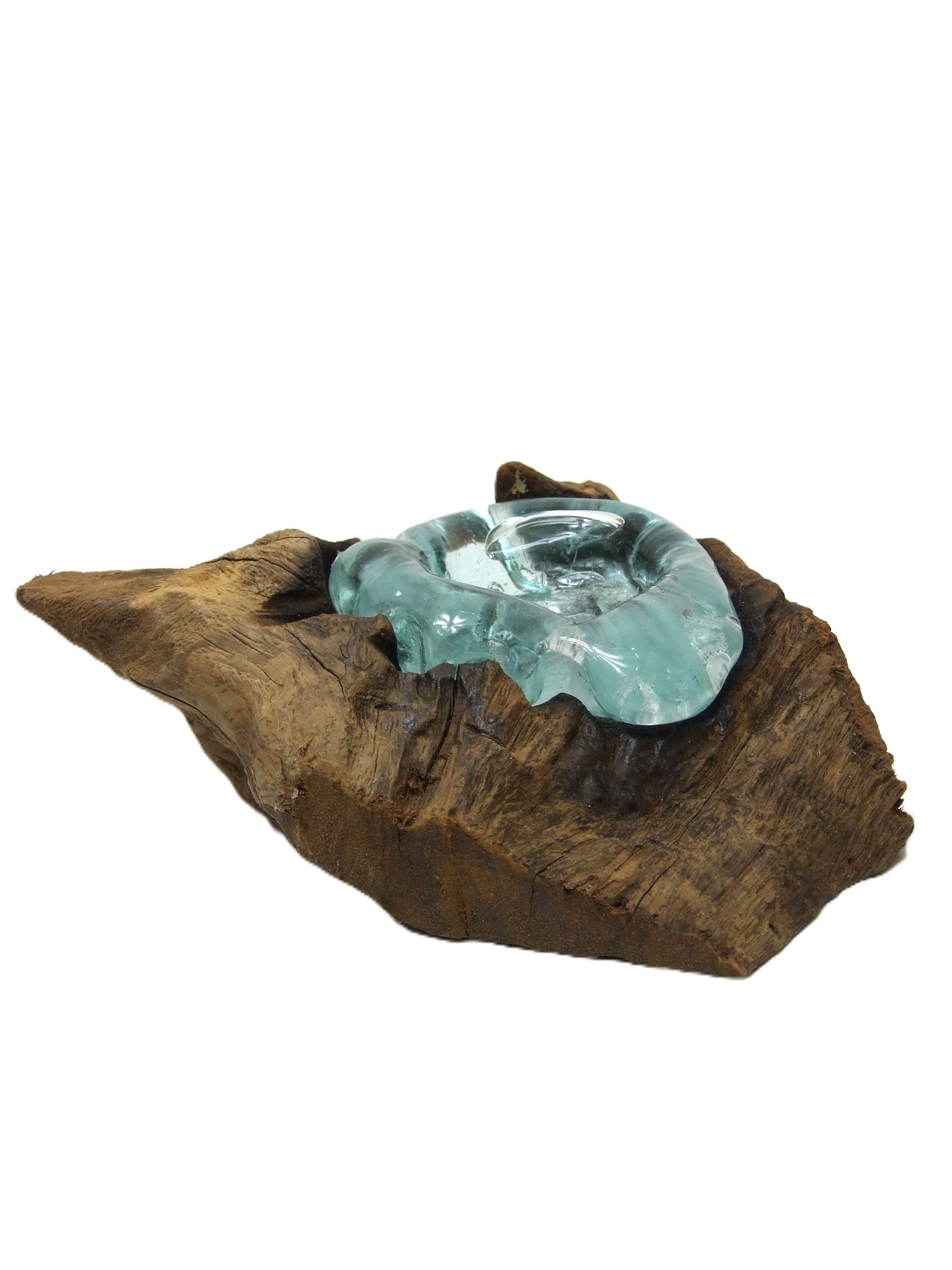 Szklany pojemnik jest idealnie dopasowany do indywidualnego kawałka drewna, zatapia się w nim.