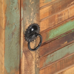 Stolik nocny jest wykonany z litego, odzyskanego drewna o mieszanym kolorze, pochodzącego z legarów, podłóg i belek nośnych ze starych rozebranych budynków. Ponadto może składać się z różnych rodzajów drewna lisciastego i tropikalnego, takich jak tek, mango itp. Oznacza to, że odzyskany materiał zachowuje właściwości tych różnych rodzajów drewna. Odzyskane drewno jest już postarzane, zwietrzałe i wysuszone. Dlatego nie kurczy się ani nie wygina. Posiada dużą komorę za drzwiami do przechowywania przedmiotów. Na solidnym blacie można wyeksponować elementy dekoracyjne. Może służyć nawet jako stolik nocny, szafka do przechowywania, stolik boczny itp.